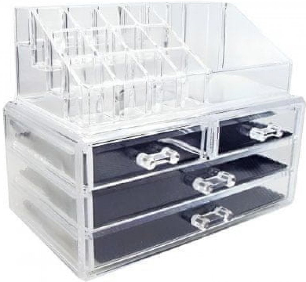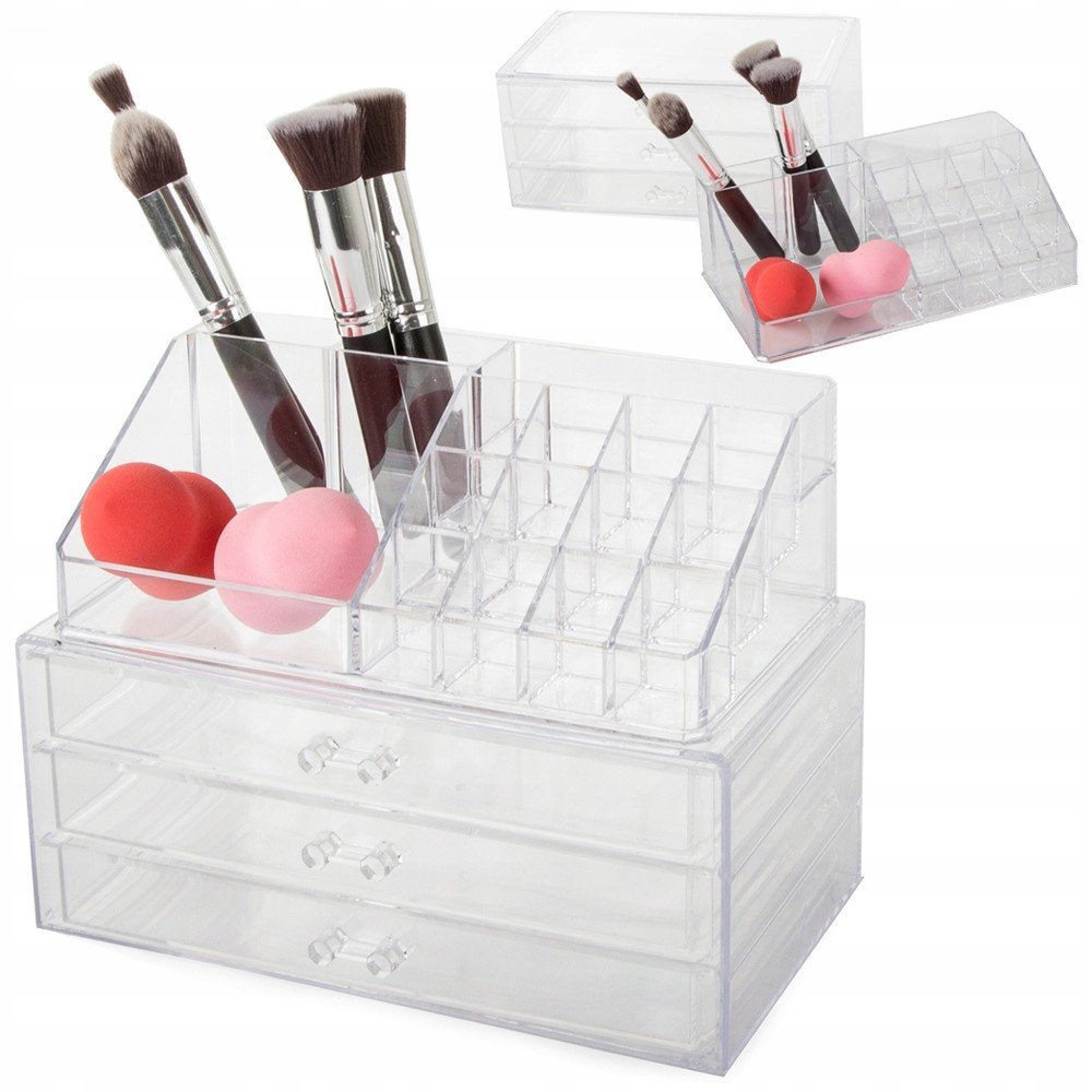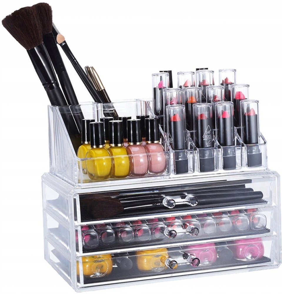 Organizer na kosmetyki i biżuterię to praktyczny i niezastąpiony gadżet w każdej sypialni lub w łazience. Wykonany został bardzo estetycznie, z przezroczystego akrylu z gładko wykończonymi krawędziami. Pasuje do wszystkich typów wnętrz, prezentując się elegancko i stylowo.Dwu częściowy organizer pomoże utrzymać porządek w kosmetykach i biżuterii. Górna część posiada 16 różnych przegródek, które pomieszczą np. szminki, lakiery, błyszczki itp. Dolna część posiada 3 szufladki na biżuterię z miękkim wykończeniem.Szufladki wysuwają się gładko oraz posiadają estetyczne uchwyty. Wewnątrz szufladek znajduje się, wyciągane, miękkie wykończenie. Szufladki natomiast można całkowicie wyjąć.Specyfikacja techniczna: