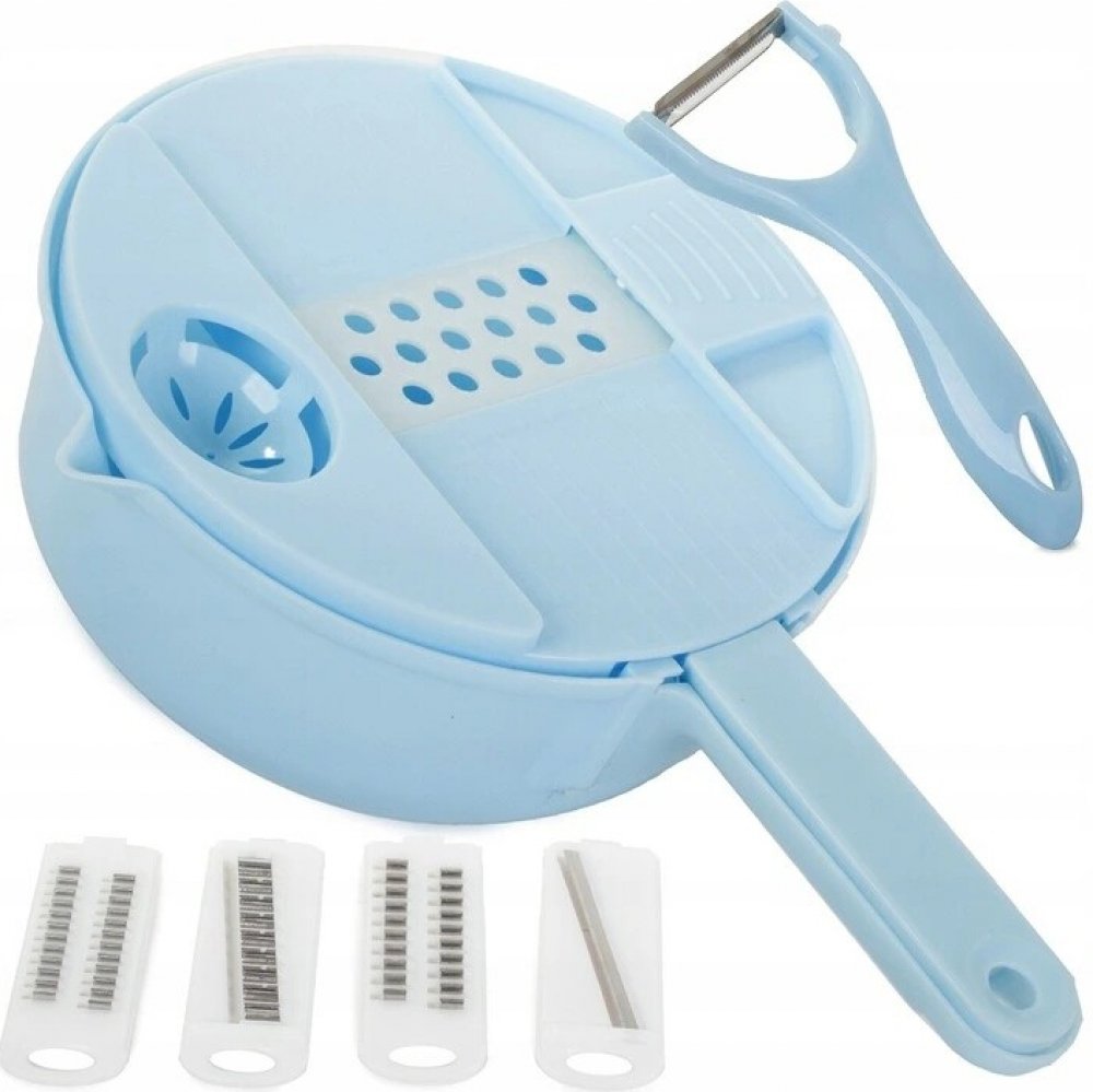 Multifunkční kráječ 8v1 vás nadchne svou praktičností. Celkem 8 funkcí, které využijete při běžném domácím vaření. Krájení zeleniny na plátky, strouhání, drcení, oddělování žloutku od bílku, tření česneku. Sada obsahuje pět výměnných čepelí a škrabku. Miska má výlevku a funguje také jako cedník při omývání ovoce nebo zeleniny.