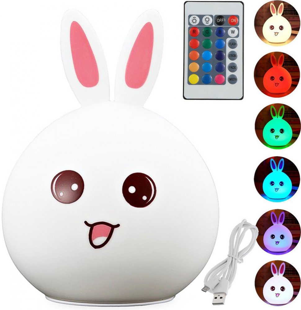 DĚTSKÁ NOČNÍ LAMPA LED SILIKONOVÁ DÁLKOVÉ OVLÁDÁNÍ RGB USB BAREVNÝ HRAVÝ KRÁLÍKPůvabná noční lampa ve tvaru králíka je ideálním dárkem pro chlapce i dívky. Skvěle zapadne do každé dětské místnosti a vytvoří teplou a klidnou atmosféru.Lampa je vyrobena z měkkého, hmatatelného silikonu. Králík je odolný proti rozbití a mačkání, takže vydrží dlouho jako lampa a měkká plyšová hračka, kterou si můžete ...
