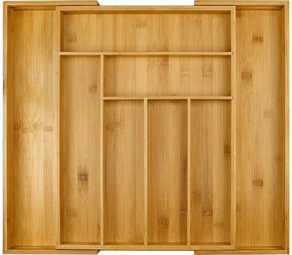 Organizér do kuchyňských zásuvek vyrobený z bambusového dřeva má jednoduchý tvar, díky kterému se hodí do moderních kuchyní.Lžíce, lžičky, nože, vidličky, naběračky – to jsou jen některé ze základních věcí v kuchyni, pro které musíte najít místo.Většinou je ukládáme do šuplíku, aby byly po ruce, díky tomuto oganizéru budete mít přehled.Organizér je velmi elegantní. Díky přírodní barvě dřeva se hodí do každé kuchyně.Odolný materiál zajišťuje funkčnost a estetický vzhled po mnoho let.Specifikace: Materiál: bambus8 přihrádek Rozšiřitelný design Rozměry: Maximální šířka (po vytažení zásuvek): 43,5 cm Minimální šířka: 30,5 cm Délka: 45,5 cmHloubka: 4 cmVýška: 5 cmRozměry horizontálních přihrádek:27,5 cm x 8,5 cm20,5 cm x 8,5 cmRozměry vertikálních přihrádek: 24,5 cm x 6,5 cm 33,5 cm x 6,5 cm 44 cm x 6,5 cm (svislá výsuvná přihrádka)