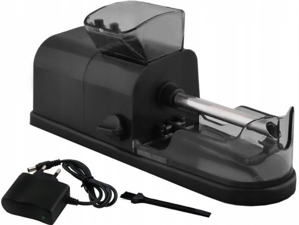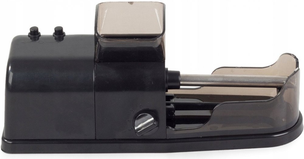 Plnička - stačí vložit dutinku, nasypat do nádobky tabák, nastavit hustotu naplnění dutinky černým knoflíkem, stisknout černé tlačítko na přístroji a cigareta je hotová.