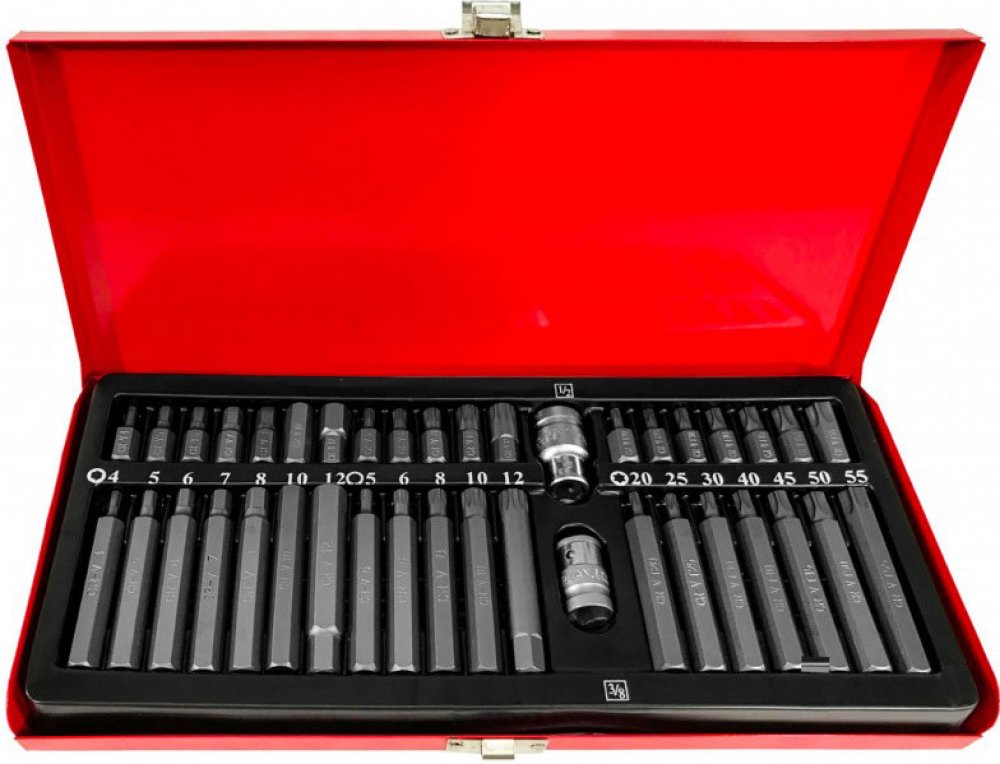 Sada bitů, určená k povolování speciálních šroubů typu hex, torx, spline. Různorodost bitů zajišťuje možnost provádění mnoha prací ve specializovaných mechanických a automobilových servisech. Koncovky mají dvě délky 30 a 75 mm, upevněné v šestihranném držáku 10 mm, přizpůsobeném pro spolupráci s ráčnou 1/2' a 3/8'. Sada je vyrobena z vysoce kvalitní uhlíkové oceli.