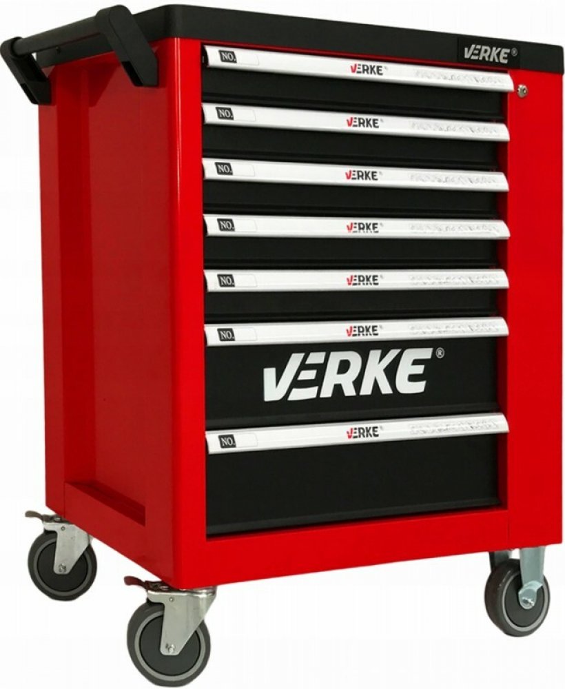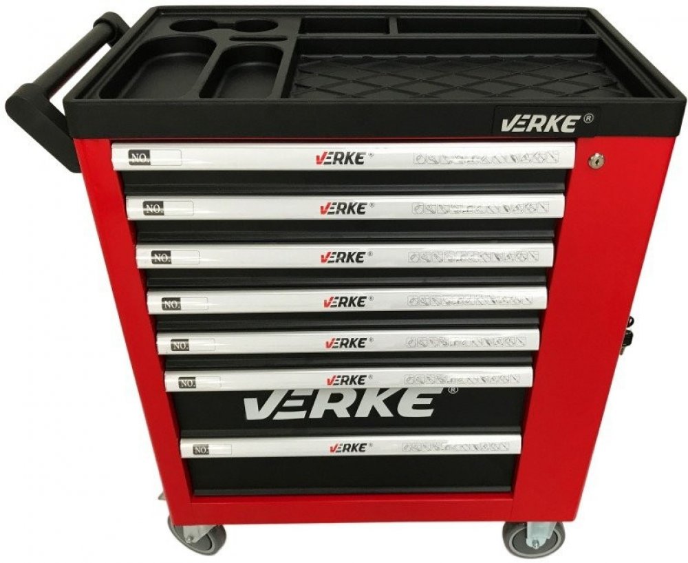 Montážní vozík 7 zásuvek se skříňkouMontážní vozík obsahuje 7 zásuvek a z boční strany skříňku na odkládání nářadí. Vozík má 5 menších a 2 větší zásuvky. V horní části je organizér na odkládání náhradních dílů. Zásuvky jsou plně vysouvatelné na kuličkových ložiskách, díky čemuž se snadno otevírají. Centrální zámek s dvěma klíči zavírá všechny zásuvky. Jednoduchý pohyb zajišťují 4 kolečka a rukojeť...