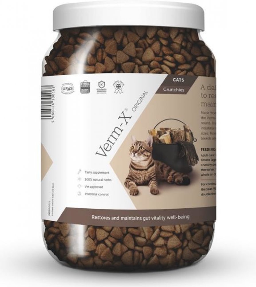 Verm - X® je vhodný pro dospělé kočky a koťata . Verm - X® pro kočky obsahují 100 % přírodní bylinu šanta kočičí, která pomáhá stimulovat kočky a koťata při hraní a cvičení . Jsou ideální pro starší kočky, které mají sklony k přibývání na váze.