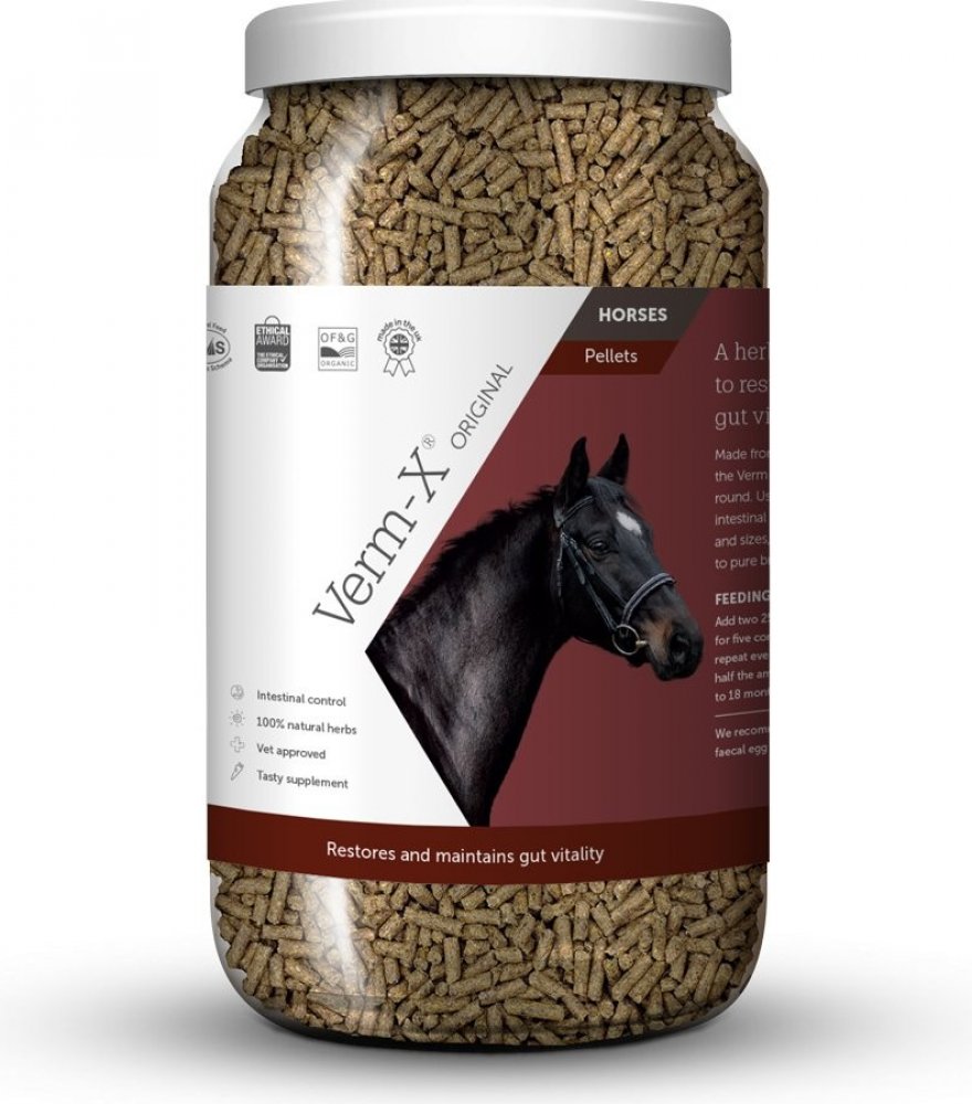Verm-X® pro koně a poníky proti střevním parazitům, je složen ze směsí bylinných přísad, které obsahují komplex aktivních částic, používající se během stovek let. Udržuje všechny oblasti hygieny zažívacího traktu, ať už kontrolu nebo ochranu. Granule mohou být podávány přidáním do krmiva nebo samostatně jako pamlsek. Kromě bylinek podporujících zažívací hygienu obsahuje Verm-X® i bylinky podporující proces čištění krve a udržování správné funkce střev. Naši zákazníci nám říkají, jak dobře vypadají jejich koně a poníci po užívání Verm-X®. Po užití přípravku Verm-X® je jejich srst opět zářivá a lesklá a jejich celková kondice se velmi zlepší. Při používání přípravku Verm-X® je vhodné, aby kontrola stolice (fekální okultní test) byla provedena 21 dní po posledním užití přípravku Verm-X®.