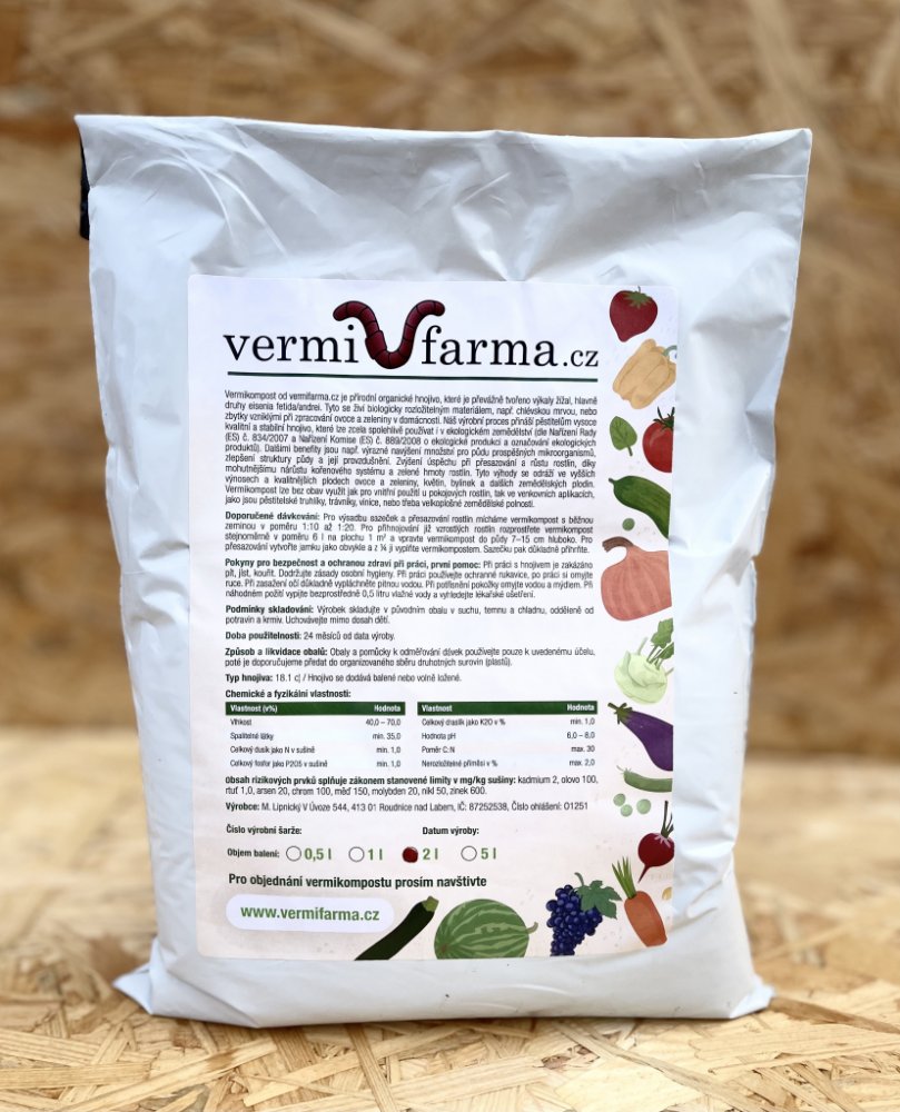 Vermikompost od vermifarma.cz je zcela přírodní organické hnojivo, které je převážně tvořeno výkaly žížal. Náš výrobní proces přináší pěstitelům vysoce kvalitní a stabilní hnojivo, které lze zcela spolehlivě používat i v ekologickém zemědělství. Náš vermikompost výrazně navyšuje množství pro půdu prospěšných mikroorganismů, zlepšení struktury půdy a její provzdušnění, což zvyšuje úspěšnost při pře...