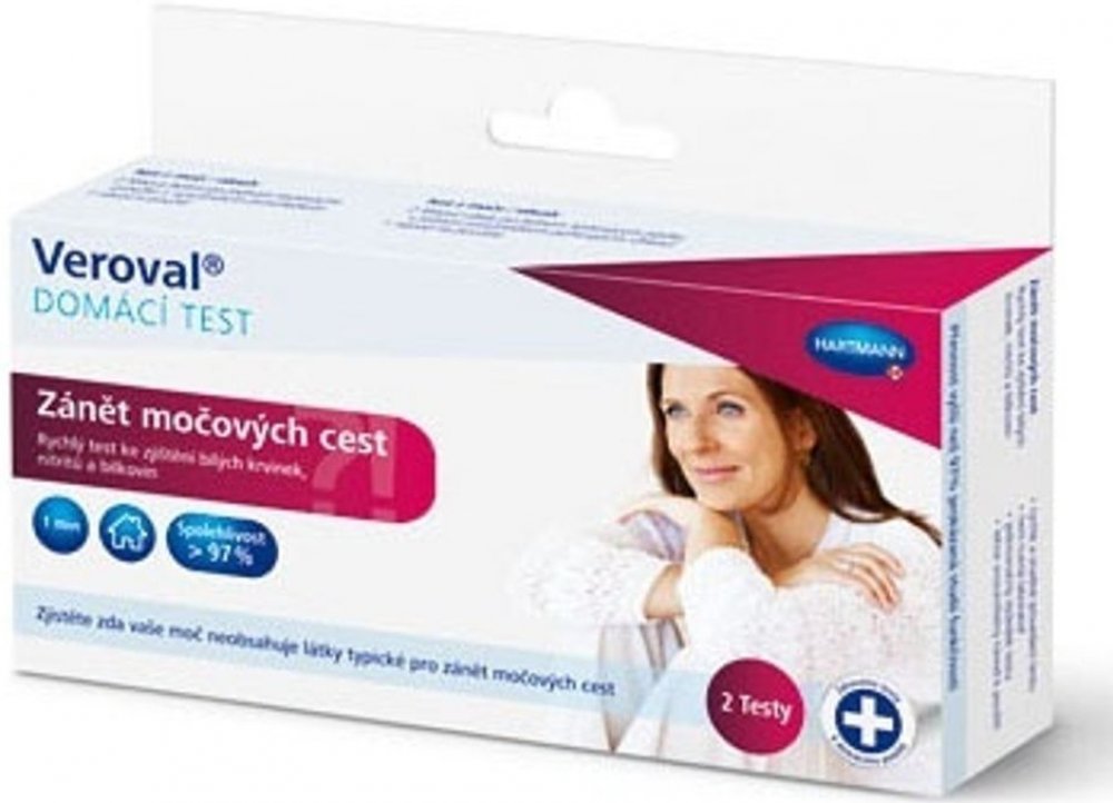 Veroval na zánět močových cest reakční proužky z moči do 1 minuty 97 % Hartmann unisex 1 ks bílé krvinky, nitrit, bílkoviny 4–30 °c domácí sebetestování