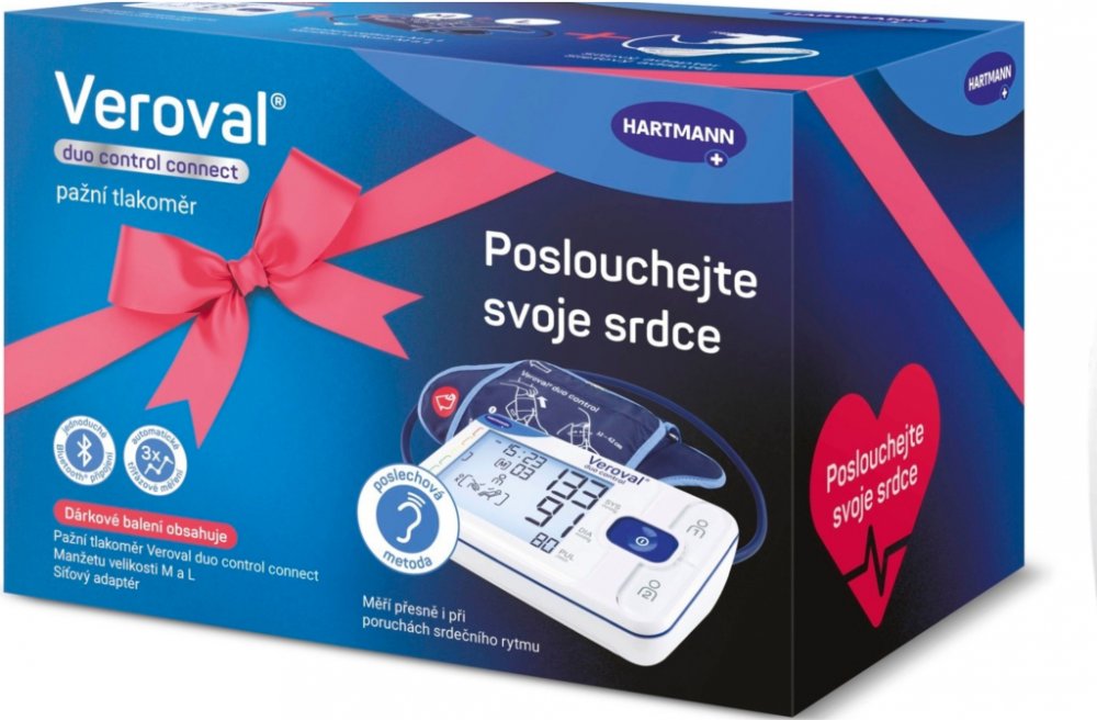 Tlakoměr na rameno HARTMANN Veroval duo control connect nabízí spolehlivý a rychlý způsob měření krevního tlaku v pohodlí domova. Patentovaná metoda měření Duo Sensor využívá ke zjišťování hodnot krevního tlaku oscilometrickou a poslechovou metodu. Kombinace těchto metod umožňuje získat přesné výsledky i v případě přítomnosti srdeční arytmie. Věroval duo control connect je obohacený o třífázové měření zvané expertní režim. Samozřejmostí je kvalita přístroje, na kterou výrobce poskytuje nadstandardní 5letou záruku. K měření se používá manžeta na rameno ve velikosti L nebo M s nastavitelným obvodem. Výsledky se zobrazují na přehledném podsvíceném displeji. Veroval duo control connect lze připojit přes Bluetooth k mobilnímu zařízení a zaznamenávat výsledky do mobilní aplikace Veroval medi.connect.