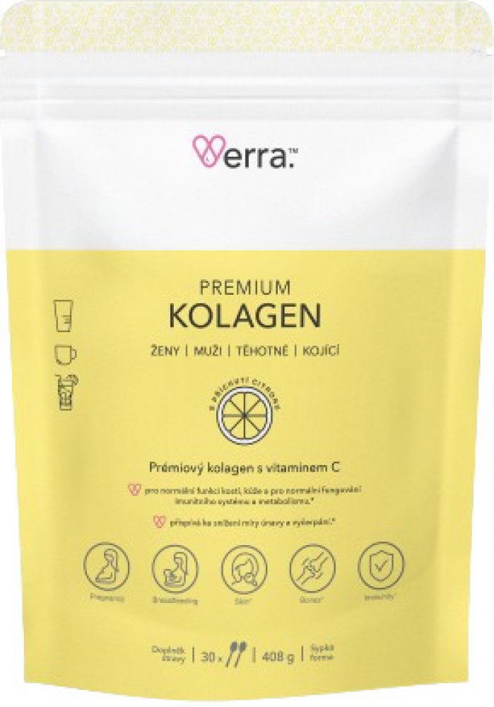 VERRA Premium Kolagen s citronovou příchutí408 gKolagen – zdraví a krása v každém věku. Kolagen je klíčová bílkovina pro pevnost a pružnost kůže, vlasů, nehtů, kloubů a pojivových tkání, jeho tvorba však s věkem postupně klesá. Doplněk kolagenu pomáhá udržet kvalitu vlasů a nehtů, podporuje regeneraci po porodu a během perimenopauzy může přispět k redukci vrásek a zachování pružnosti pokožky. Pro těhotné ženy napomáhá pokrýt zvýšené výživové nároky a podporuje celkovou vitalitu organismu. Navíc má příjemnou svěží citronovou přírodní příchuť, která zpříjemňuje každodenní užívání. Pozor – čtěte složení kolagenových doplňků!Ne všechny produkty jsou stejné – náš kolagen obsahuje vysoce kvalitní složky, a jedna denní dávka přináší plné množství aktivních látek, které podporují pokožku, vlasy, nehty, klouby i celkovou vitalitu. Díky tomu máte jistotu, že tělu dodáváte skutečně účinnou podporu. Náš Prémiový kolagen s podporou vitaminu CDenní dávka obsahuje 12,5 g...