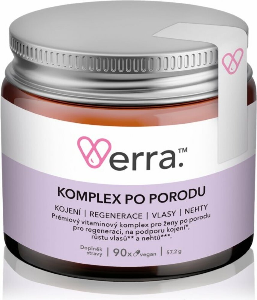 Verra Komplex po porodu je prémiový doplněk stravy pro ženy po porodu na regeneraci, podporu kojení, růst vlasů a pro udržení normálního stavu pokožky.