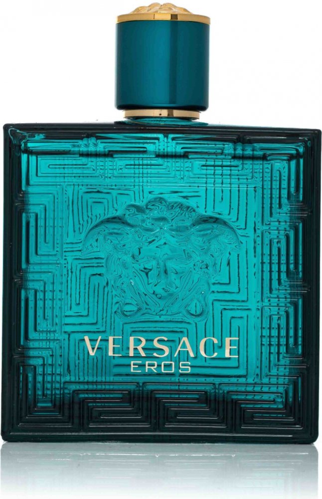 Flakon zaujme na první pohled tyrkysovou barvou v mužně sytém odstínu evokujícím hladinu Středozemního moře pableskující ve slunci. Najdeme v něm ale i odkaz na antické umění a kulturu adaptované do moderního stylu. Zlatý rytý nápis Versace Eros dominuje centrální části flakonu.
