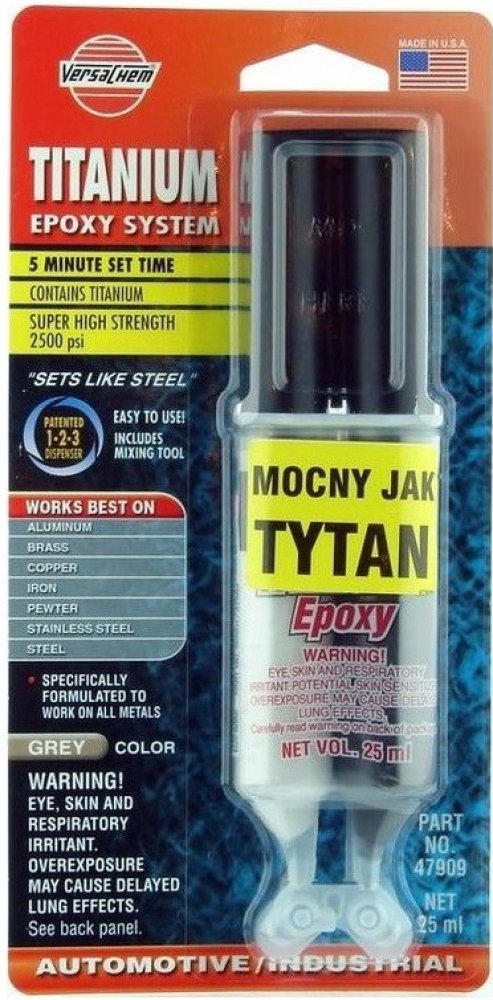 Versachem Dvousložkové epoxy lepidlo s obsahem titanu je speciální dvousložkové lepidlo s obsahem mikročástic titanu na spojení ploch či opravy rozlomených a jinak poškozených dílů z kovů: ocel, nerez - železo - hliník - mosaz - měď - cín. Vytváří šedý, velmi pevný, nárazuvzdorný spoj odolný proti vlhkosti a chemikáliím.
