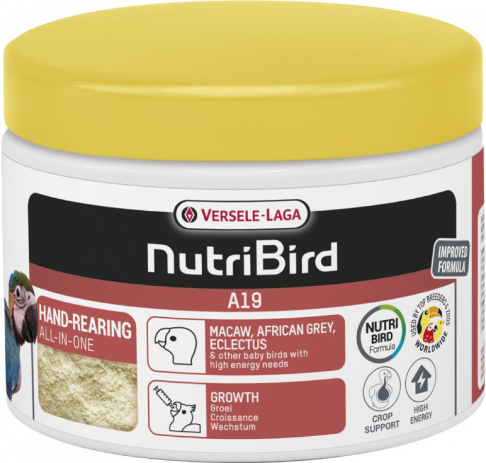 Ruční dokrmovací krmivo pro ary, africké šedé papoušky a eklektusy a ostatní ptačí mláďata s požadavkem na vysoký obsah energie.