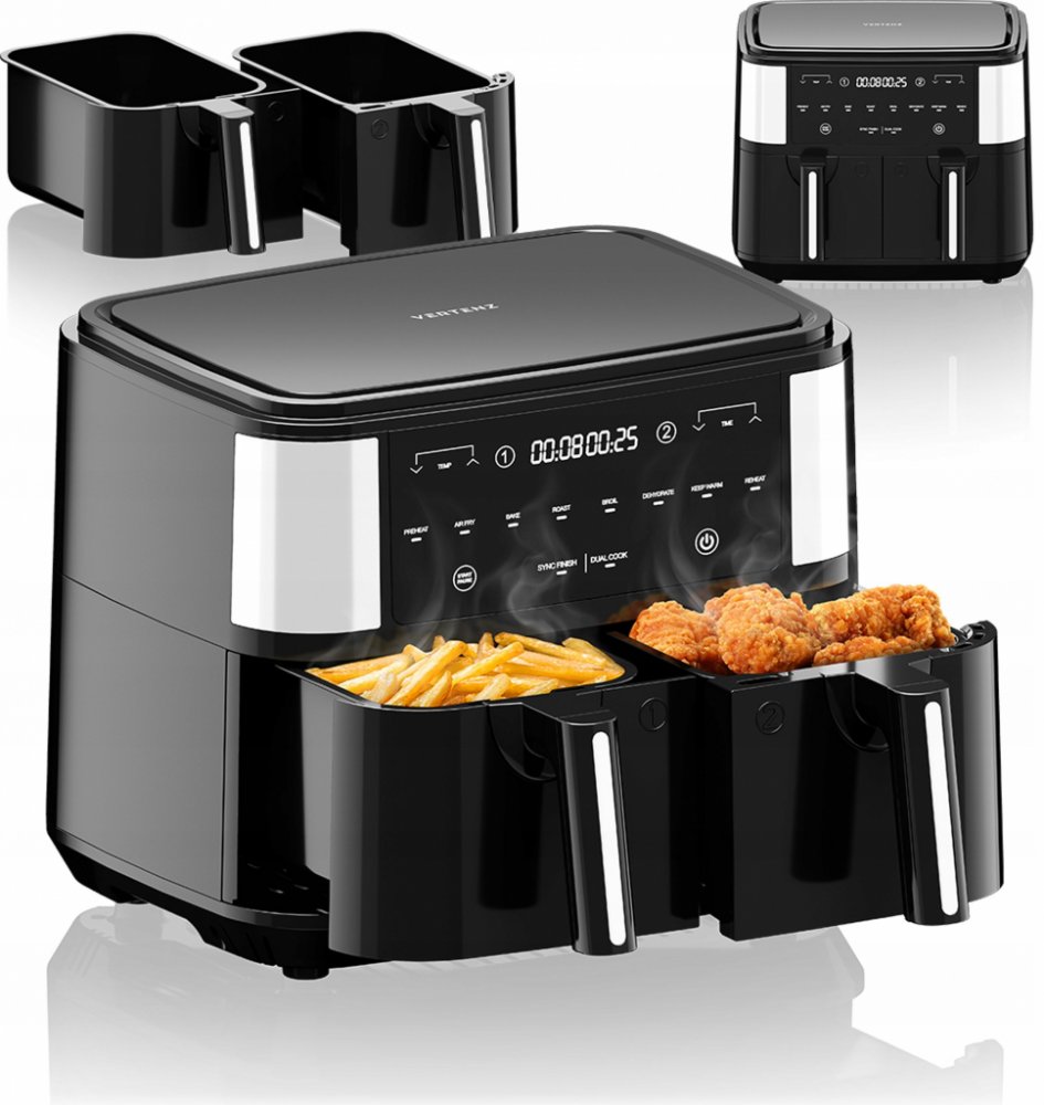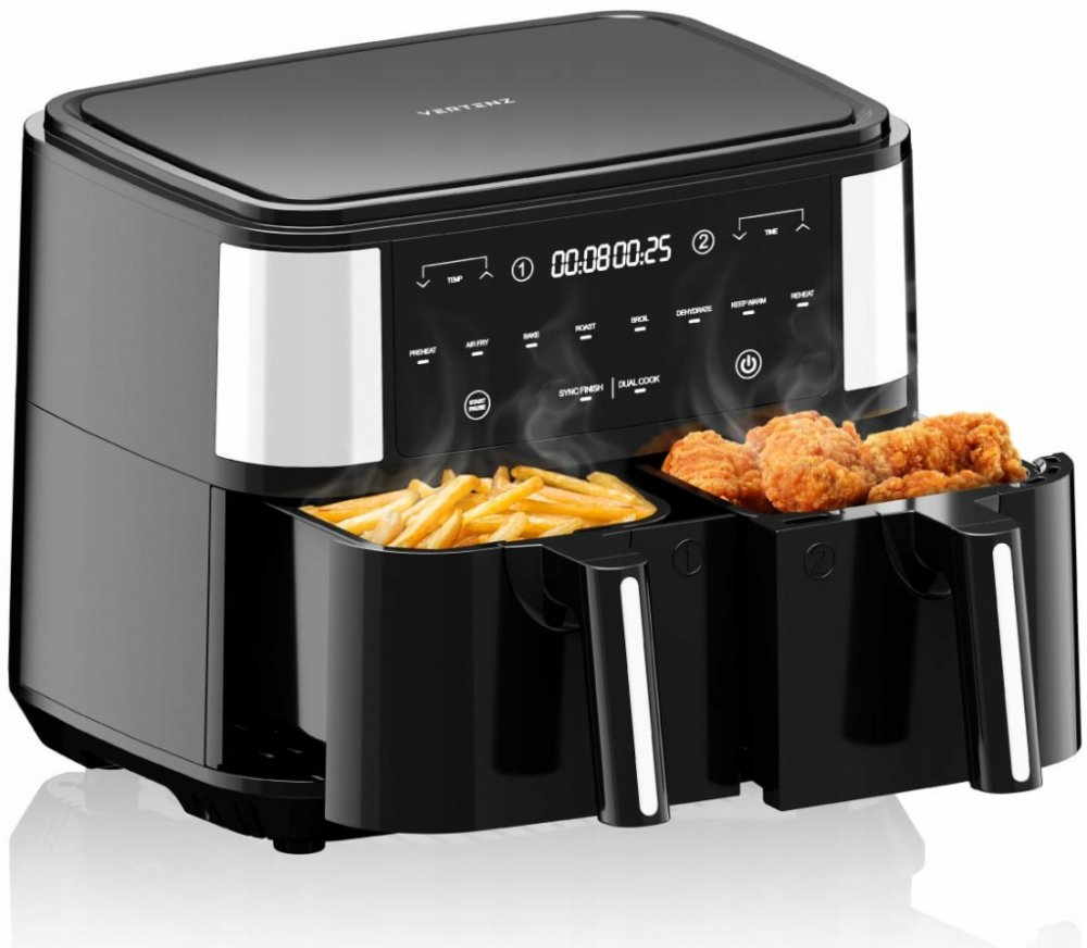 - Beztuková fritéza Taste 90 umožňuje vaření 2 různých pokrmů s využitím jiných funkcí, teplot nebo časů vaření – díky funkci Sync Finish obě zóny dokončí práci ve stejný okamžik.