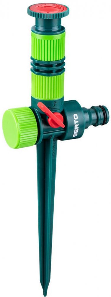 Zahradní zavlažovač, rozsah zavlažování 0° až 360°, max. zavlažovací plocha 78 m2, 15G785 VERTO je stojatý pevný zadešťovač vhodný na zahrady, trávníky, parcely nebo v blízkosti pozemků. Postřikovač může zajistit všestranné pokrytí zavlažováním, které lze zúžit na část celého kruhu a zahrnuje ovládání průtoku zavlažování. Plastový nášlapný bodec zajišťuje stabilní instalaci do země. To udržuje zav...
