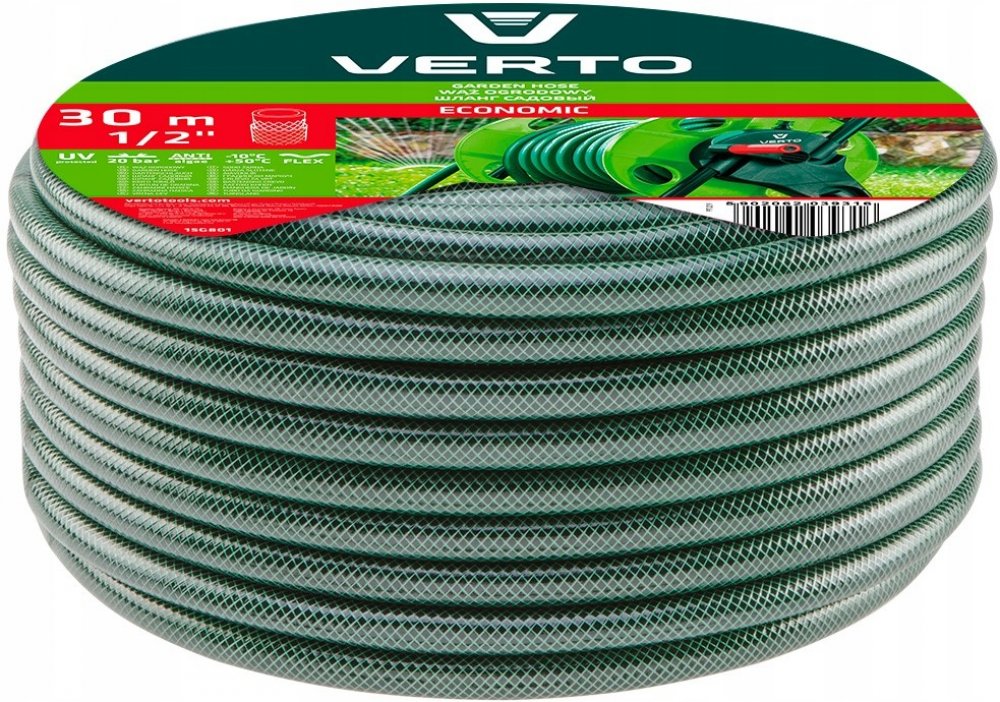 30 m zahradní hadice, 1/2" ECONOMIC, odolná proti UV záření, pevnost v tahu 24 barů, systém proti řasám, teplotní rozsah, při kterém si hadice zachovává všechny své parametry (především pružnost) -10 °C až +60 °C. Zahradní hadice ECONOMIC 30 m, 1/2" VERTO (ref. 15G801). Ochrana proti nepříznivým účinkům slunečního záření a systém proti řasám umožní efektivní a bezproblémový provoz po dlouhou dobu. Zahradní hadice umožňuje průtok vody pod tlakem až 24 barů. Hadice si zachovává všechny své výkonnostní parametry v teplotním rozmezí od - 10 do + 60 °C.
