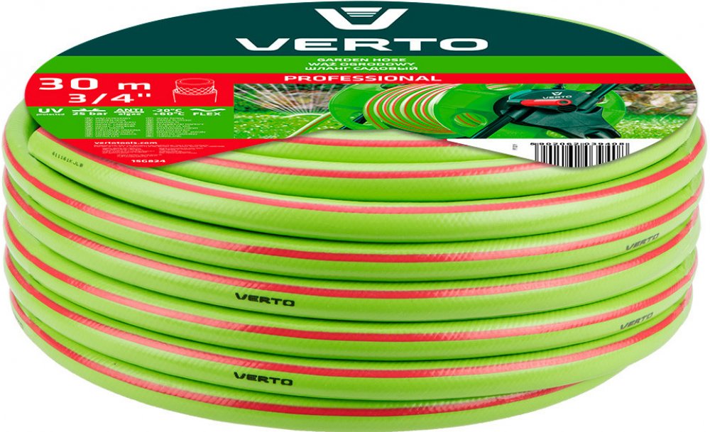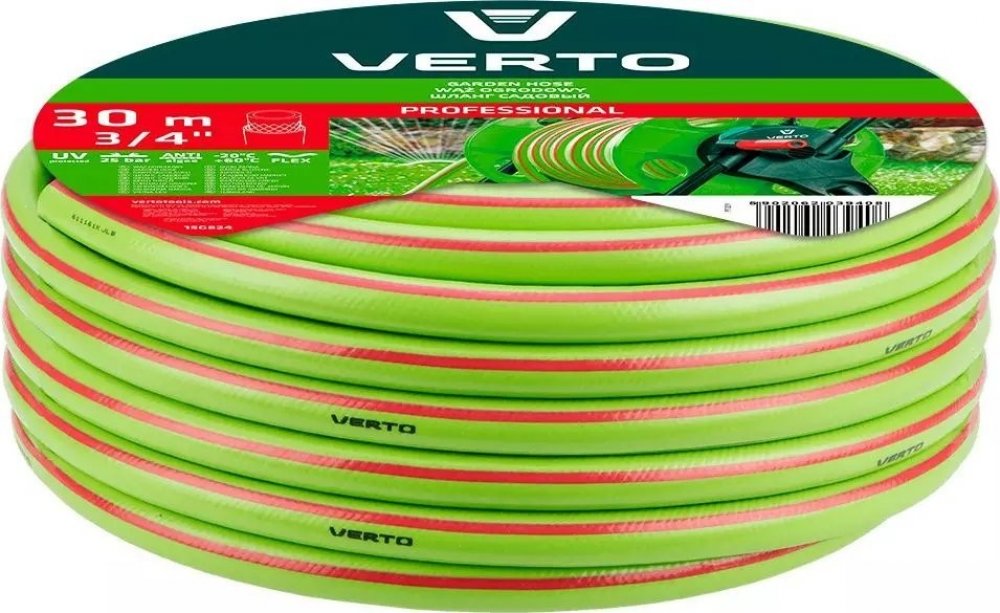 Zahradní hadice, 30 m, 3/4” PROFESSIONAL, 15G824 VERTO je špičková, třívrstvá, odolná zavlažovací hadice z produktové řady VERTO PROFESSIONAL. Tato hadice je vyrobena z vysoce kvalitních materiálů a má průtržný tlak 25 barů.