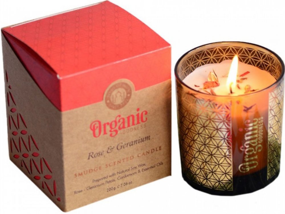 Sójové svíčky Organic Goodness jsou díky použitým esenciálním olejům vhodné pro aromaterapii a relaxaci. S okouzlující vůní přírodních olejů pravé růže a pelargónie zakončená okvětními lístky růží.Svíčka je vyrobena ze 100 % přírodního sójového vosku. Neobsahuje žádné škodlivé látky, je bez toxinů, s přírodními vonnými oleji a je vhodná i pro alergiky.Ve vosku jsou pro podtržení přírodního designu použity větvičky, bylinky či koření. Vosk je ručně litý do atraktivní skleněné dózy se zlatým motivem květu života. Baleno v dárkové papírové krabičce.Doba hoření: 50 hod