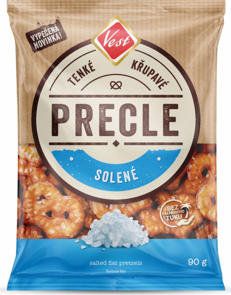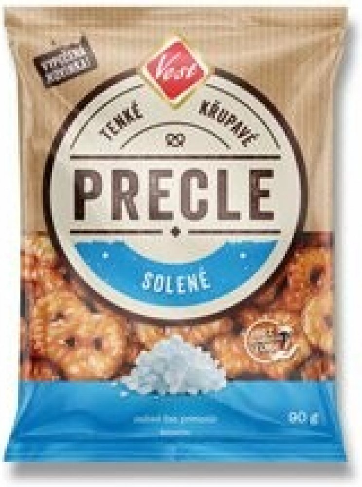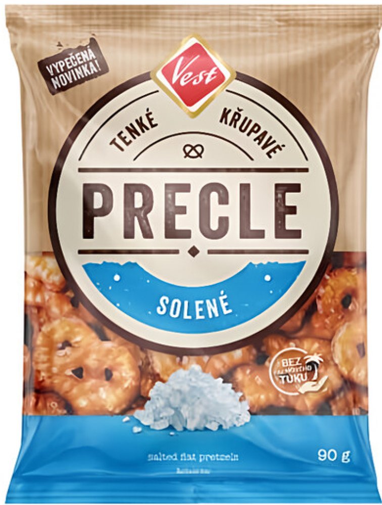 Vest Precle solené 90 g. Tenké, křupavé a mimořádné dobré. Precle jsou pečené preclíkové chipsy, které jsou skvělou alternativou k mastným smaženým brambůrkům. Upečeno z české mouky a bez palmového oleje. Složení : Pšeničná mouka, rostlinný olej (řepkový, a slunečnicový v různém poměru), cukr, jedlá sůl, ječný sladový výtažek, regulátor kyselosti (hydroxid sodný), pšeničný škrob, kypřicí látky (uh...
