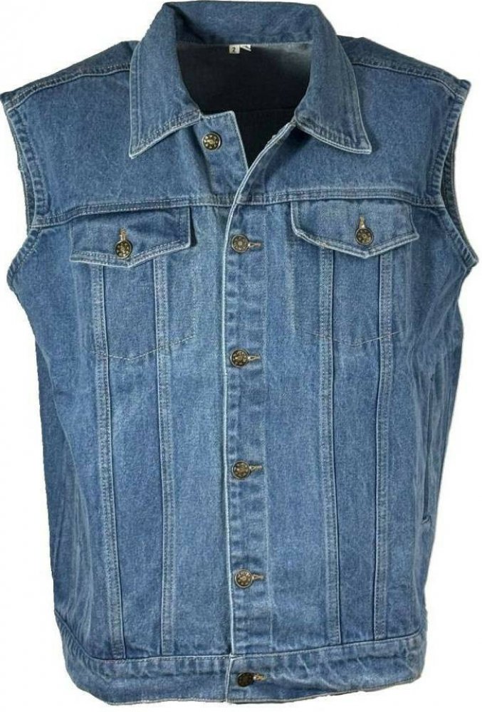 Pánská džínová vesta vyrobená ze 100% bavlny, má dvě dolní boční kapsy a dvě horní kapsy na knoflík.