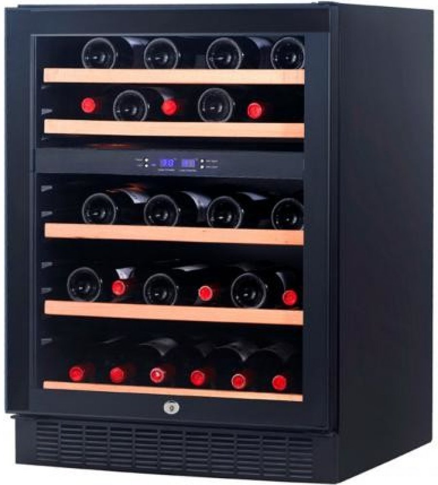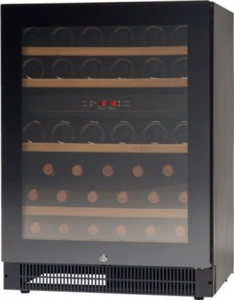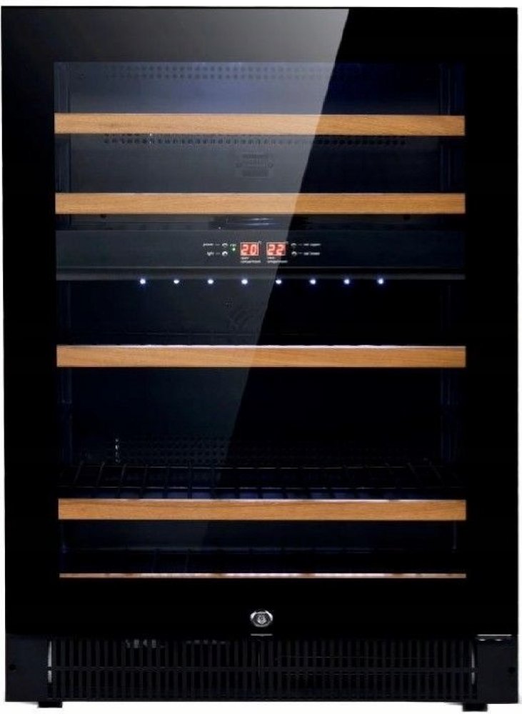Jednodveřová vinotéka s nastavitelnou rozdílnou teplotou v horní a dolní části.