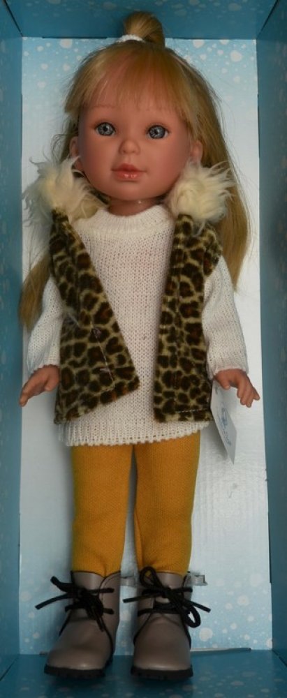 Paulína v leopardí vestě je krásná realistická panenka od firmy Vestida de Azul ze Španělska, která měří 33 cm a celé tělíčko má vyrobené z vinylu. Paulína má dlouhé blonďaté vlasy a modré akrylové nemrkací oči s nalepenými řasami. Je oblečená do bílého pleteného svetříku a kalhot okrové barvy. Přes svetr má vestu s leopardím vzorem. Na nohou má vysoké šedé boty na zavazování.