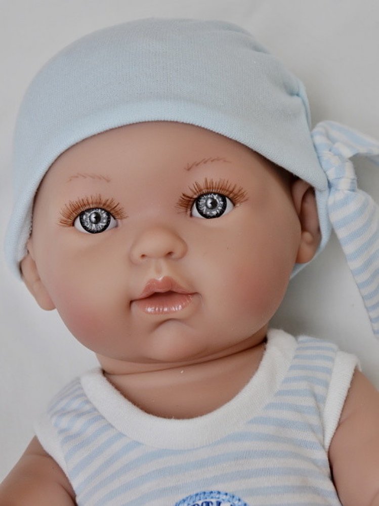 Krásné realistické miminko chlapeček Tonino pirát je vyrobeno firmou Vestida de Azul ve Španělsku. Je 42 cm dlouhé, jeho tělíčko je tvrdé, vyrobené z vinylu. Má akrylová očka a nalepovací řasy. Je oblečený do modrobílého pruhovaného bodíčka a "pirátské" čepice. Má dudlík. Miminko splňuje bezpečnostní a zdravotní normy (CE). Doporučeno pro děti od 3 let.
