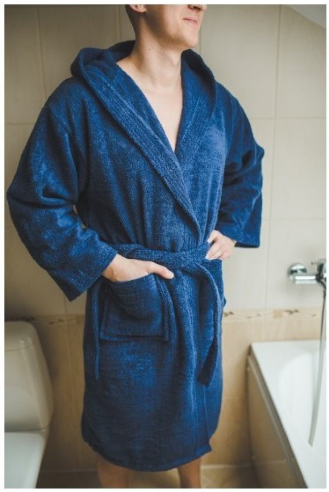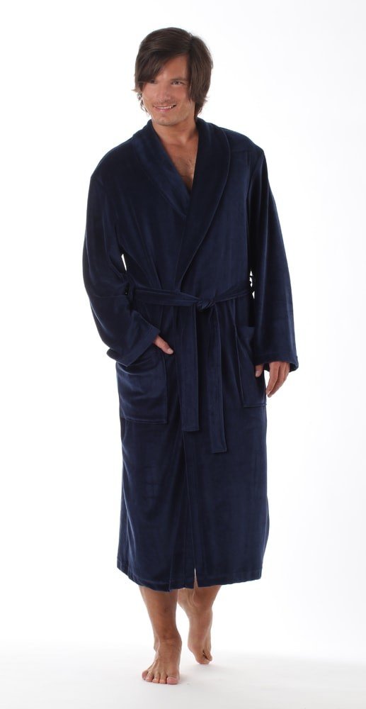 Hřejivý pánský župan má dvě kapsy a uprostřed pásek na zavazování.