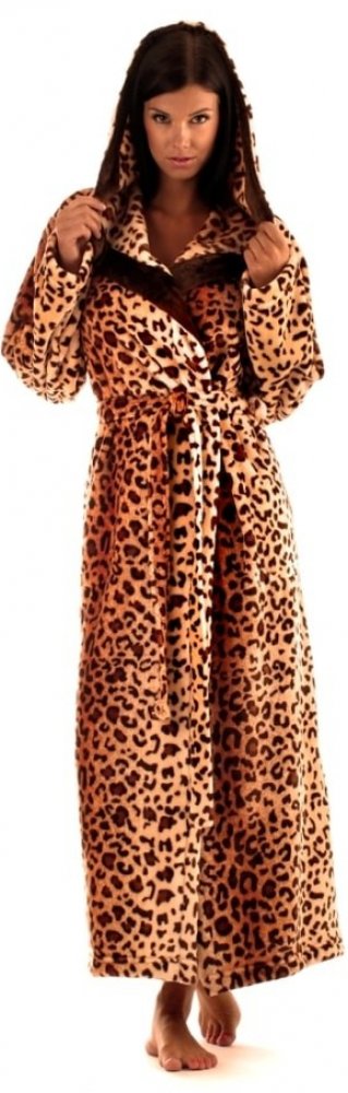 Dlouhý dámský župan Jungle s kapucí od českého výrobce Vestis. Dlouhý župan v moderním a oblíbeném leopardím vzoru. Župan má kapuci a zavazování v pase.
