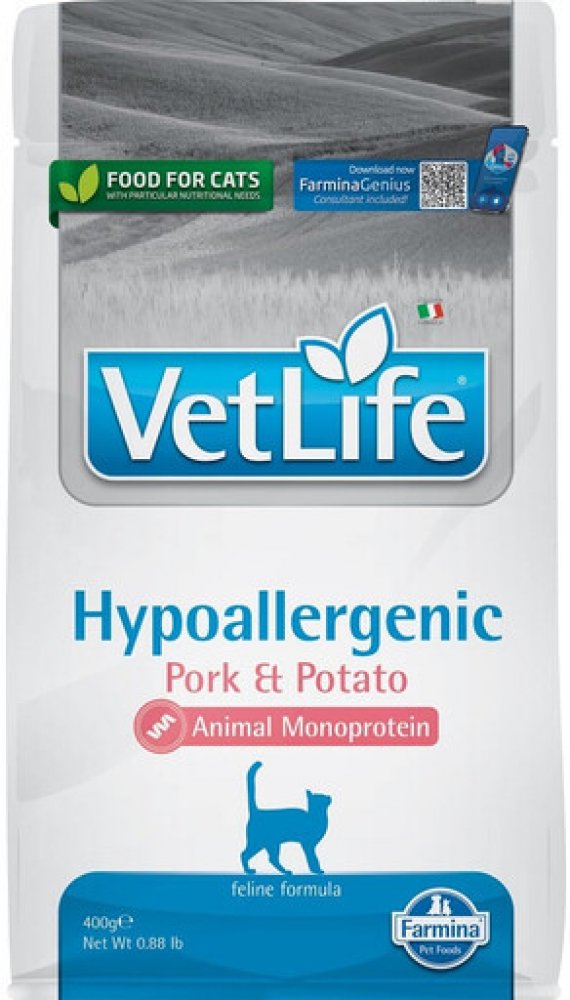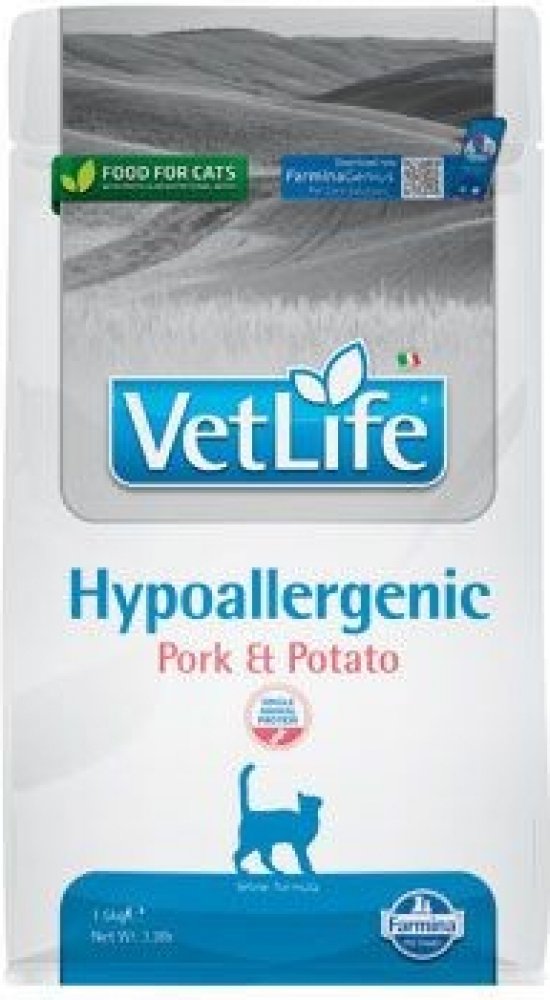 Farmina Vet Life Hypoallergenic Pork & Potato je kompletní dietetické krmivo pro kočky určené pro snížení výskytu potravinových alergií a nesnášenlivostí. Používá se také pro podporu funkci kůže v případě kožních poruch a nadměrné ztráty srsti.