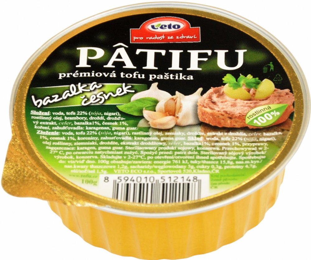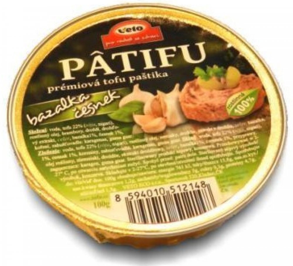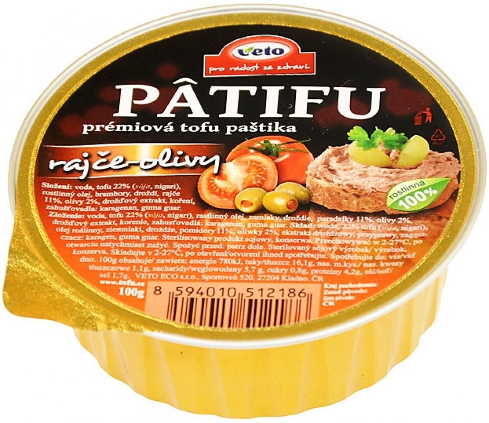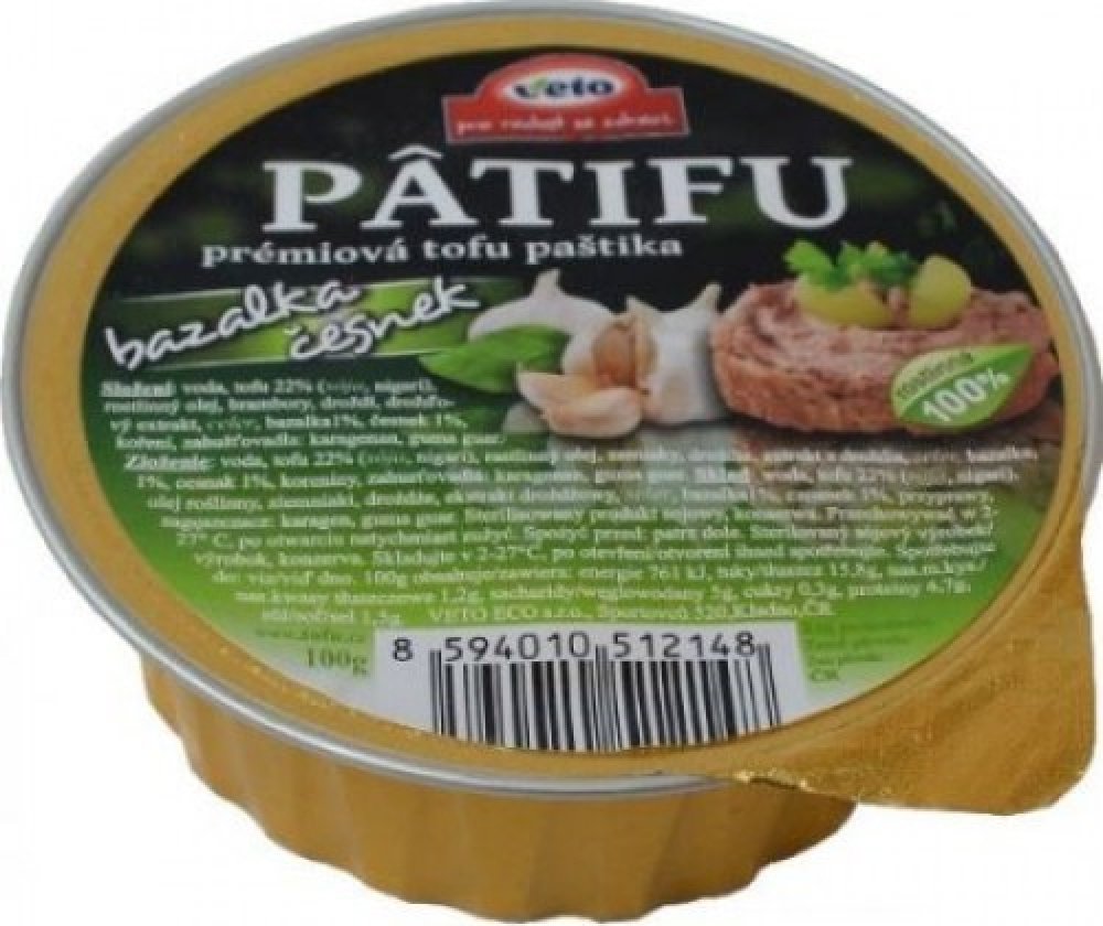 PATIFU paštika se z 1/4 skládá z tofu, které si společnost Veto sama vyrábí a ještě za čerstva přidává do pomazánek. Veto se výrobě tofu věnuje již přes 20 let a používá zásadně certifikovanou a testovanou sóju bez genetické modifikace.