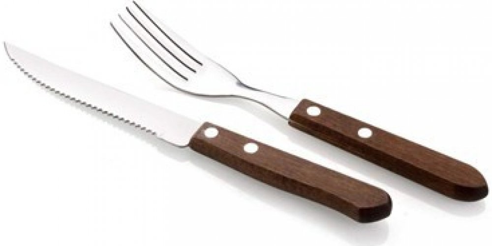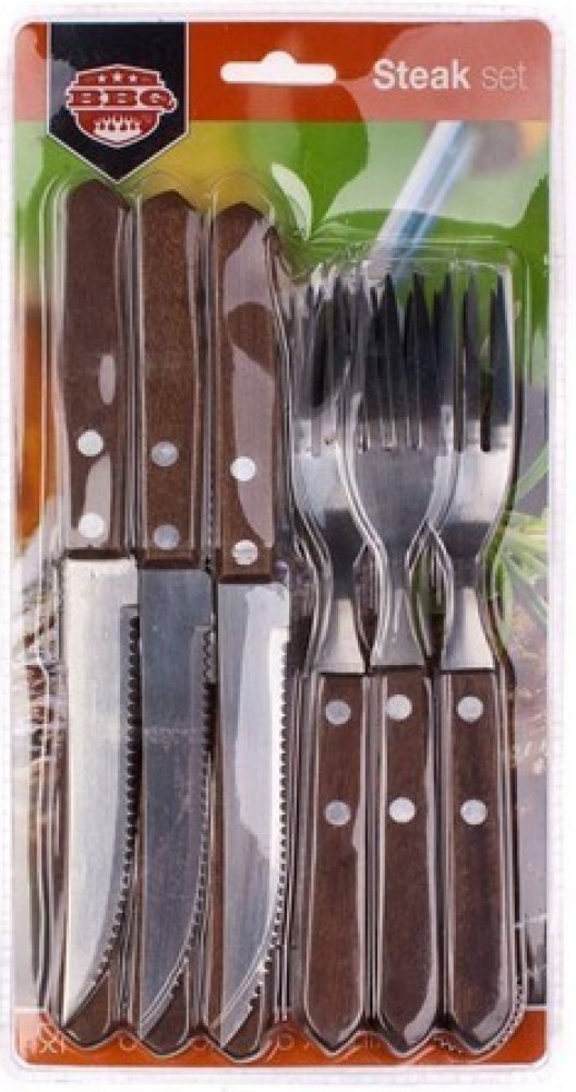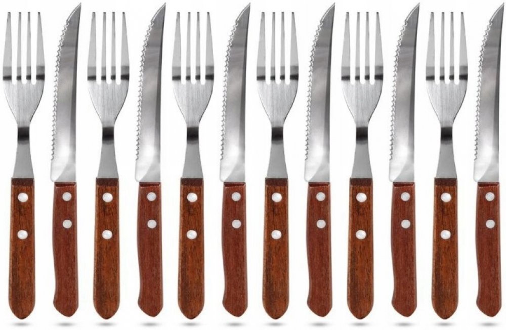 12 dílný steakový set využijete při servírování grilovaných jídel. Materiál sady: nerez / dřevo. Síla čepele nože: 1,2 mm / vidlička 1,5 mm. Povrchová úprava čepele: lesk. Celková délka nože je 20,6 cm, délka čepele: 11,5 cm, síla držadla 0,9 cm.Celková délka vidličky se 4 hroty: 18,7 cm, délka čepele: 9,6 cm, síla držadla 0,9 cm. Složení sady: 6x vidlička a 6x nůž