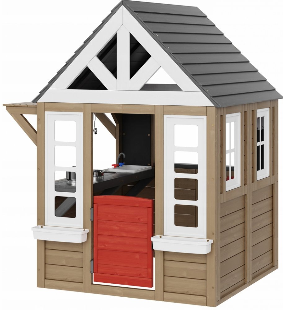 Tento domeček na hraní pro děti je navržen tak, aby odolával povětrnostním vlivům, s povrchem upraveným vodou ředitelnou barvou, včetně odolnosti proti UV záření a plísním, aby vydržel drsné podmínky.