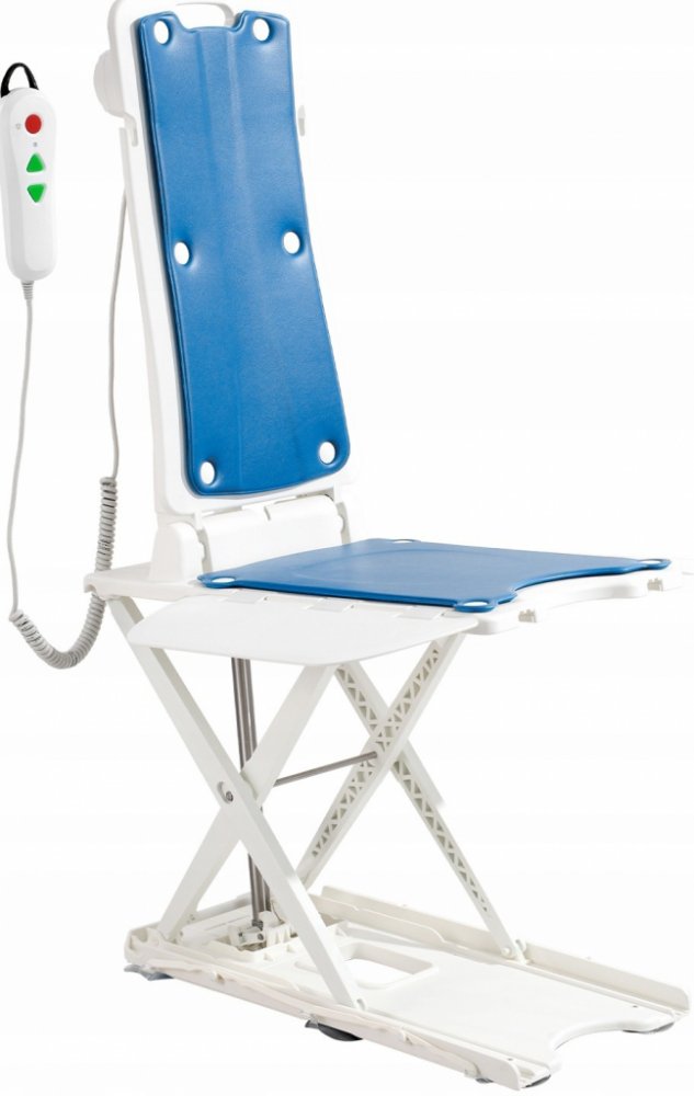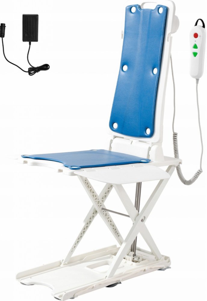 Odchylka opěradla 45°: Když je zvedák v nejnižší poloze, opěradlo se naklání pod úhlem 45°, podobně jako u vanového křesla, což uživateli poskytuje větší komfort při koupání. Když se opěradlo nepoužívá, lze jej složit, aby se ušetřilo místo a usnadnilo skladování nebo přeprava.