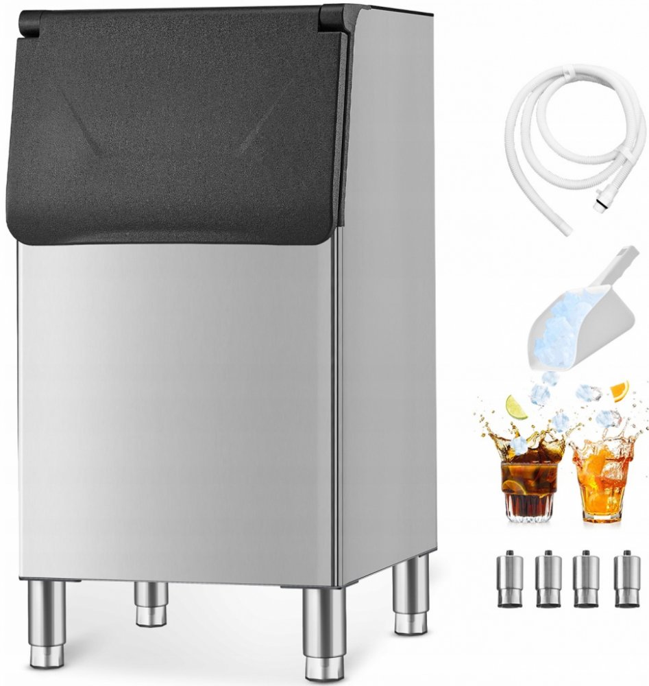 Další funkce: Zásobník na led je vybaven dvířky s tlumičem, které zabraňují zranění a snižují hluk a vibrace. Pojme velké množství ledu, takže je ideální pro komerční kuchyně, restaurace, bary, hotely a obchody s alkoholem.