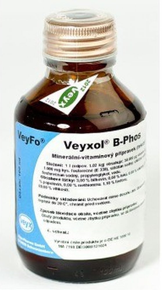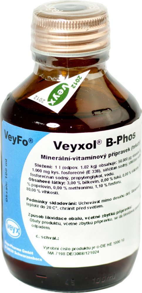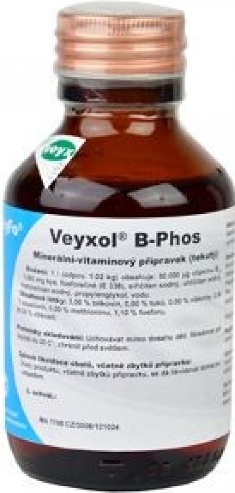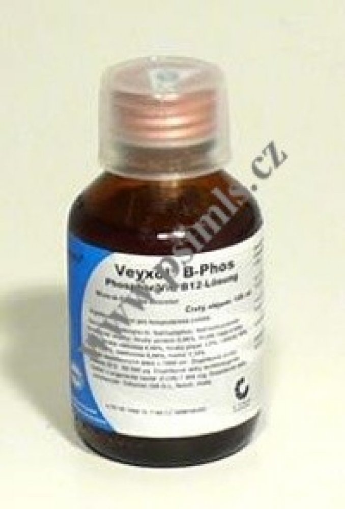 Emulze na minerální bázi obsahující fosfor a vitamín B12. Veyxol B-Phos 100ml z kategorie Vitamíny pro hospodářská zvířata Veyx . Emulze na minerální bázi obsahující fosfor a vitamín B12. Doplnění výživové potřeby organismu. Podává se v období zvýšené zátěže (porod, transport, teplotní výkyvy).