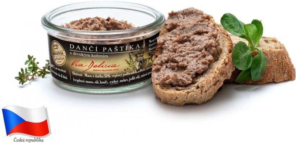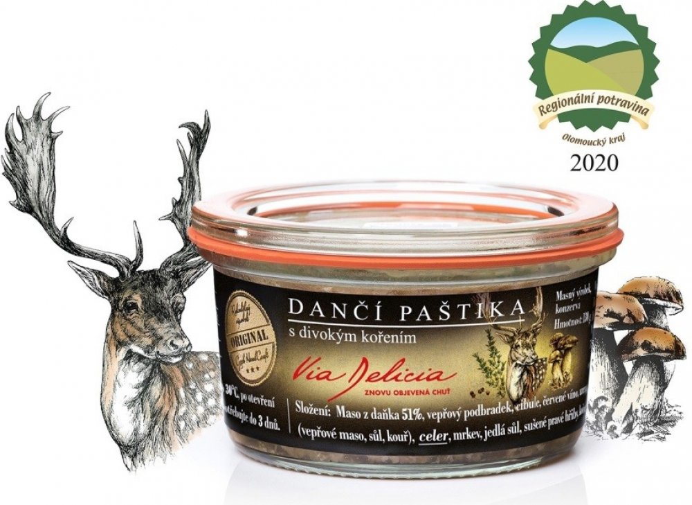 Daněk byl považován za královskou lovnou zvěř chovanou v mnoha panských oborách. Nyní se vyskytuje celkem hojně i ve volných honitbách. Má vynikající, chuťově výrazné maso podobné jelenímu. V paštice od Via Delicia dančí maso zkombinovali s divokým kořením, bylinkami a lesními houbami. Doporučujeme ochutnat společně s výraznějším červeným vínem.