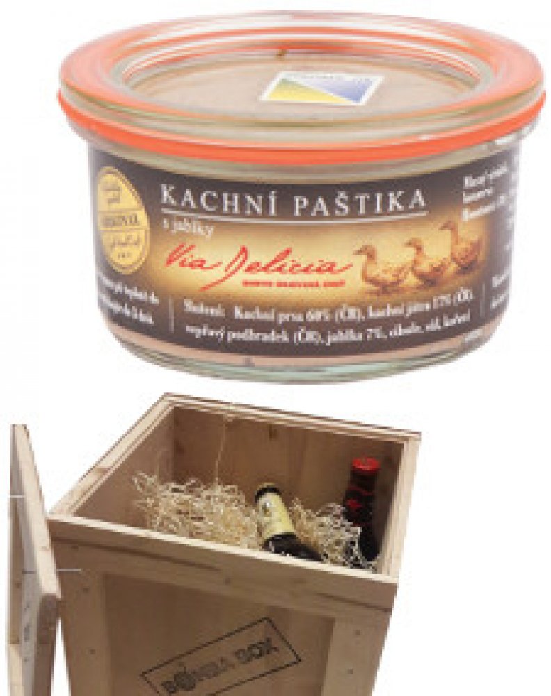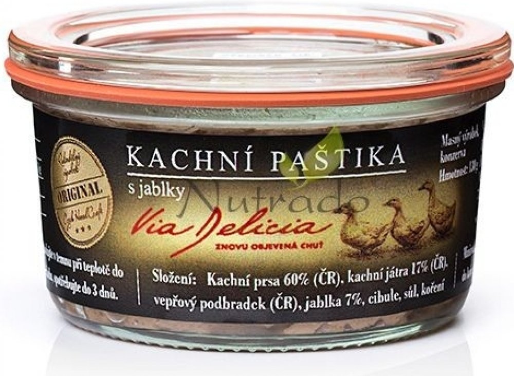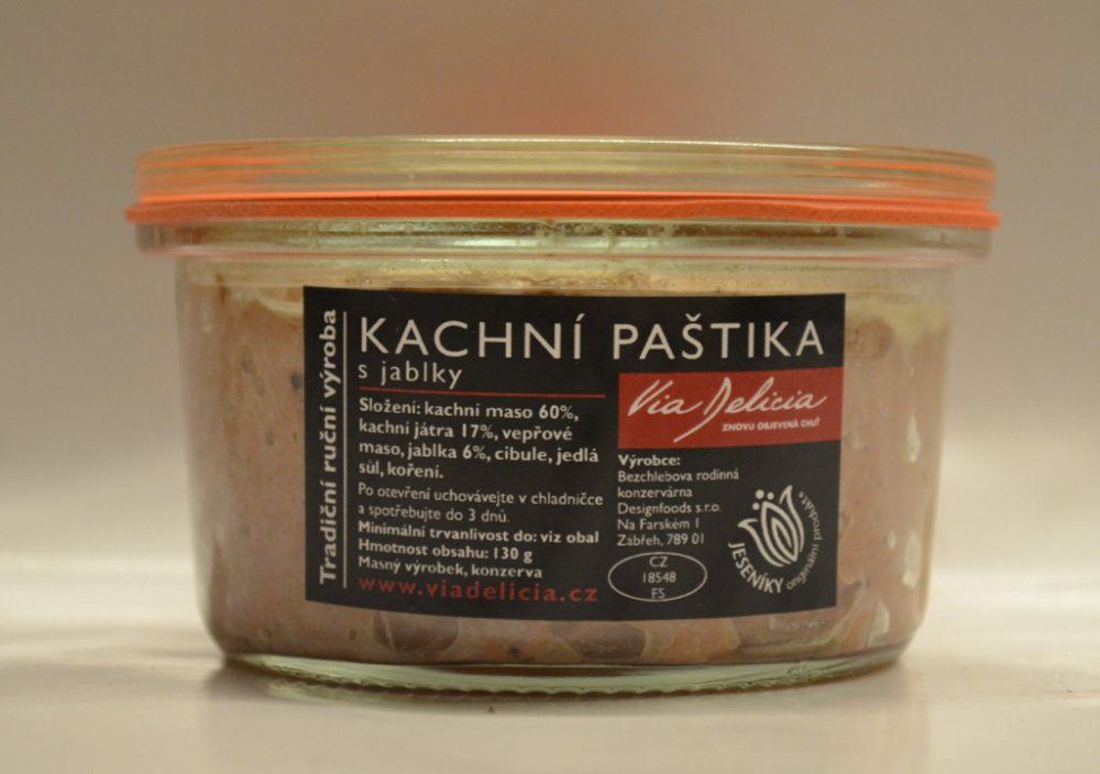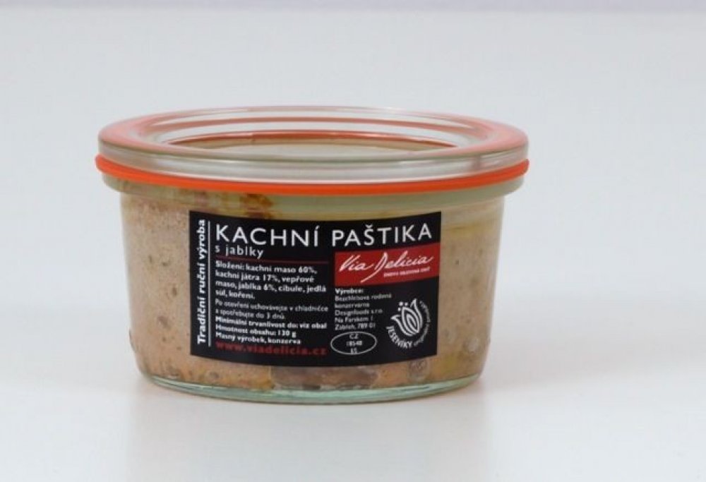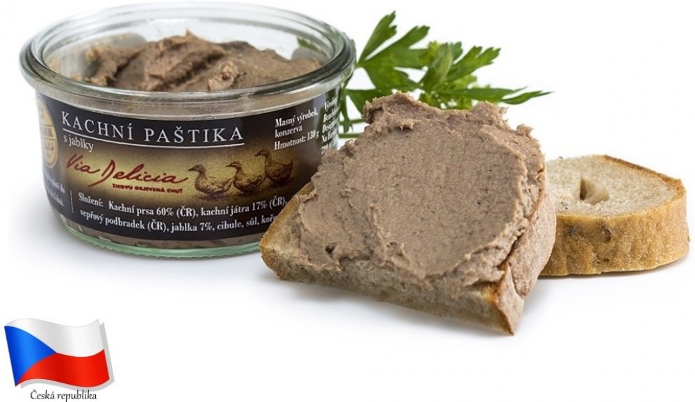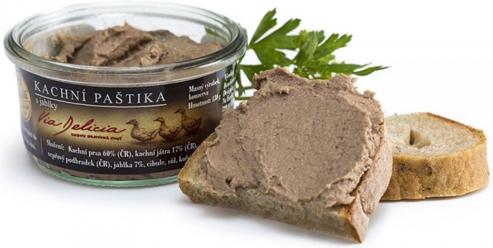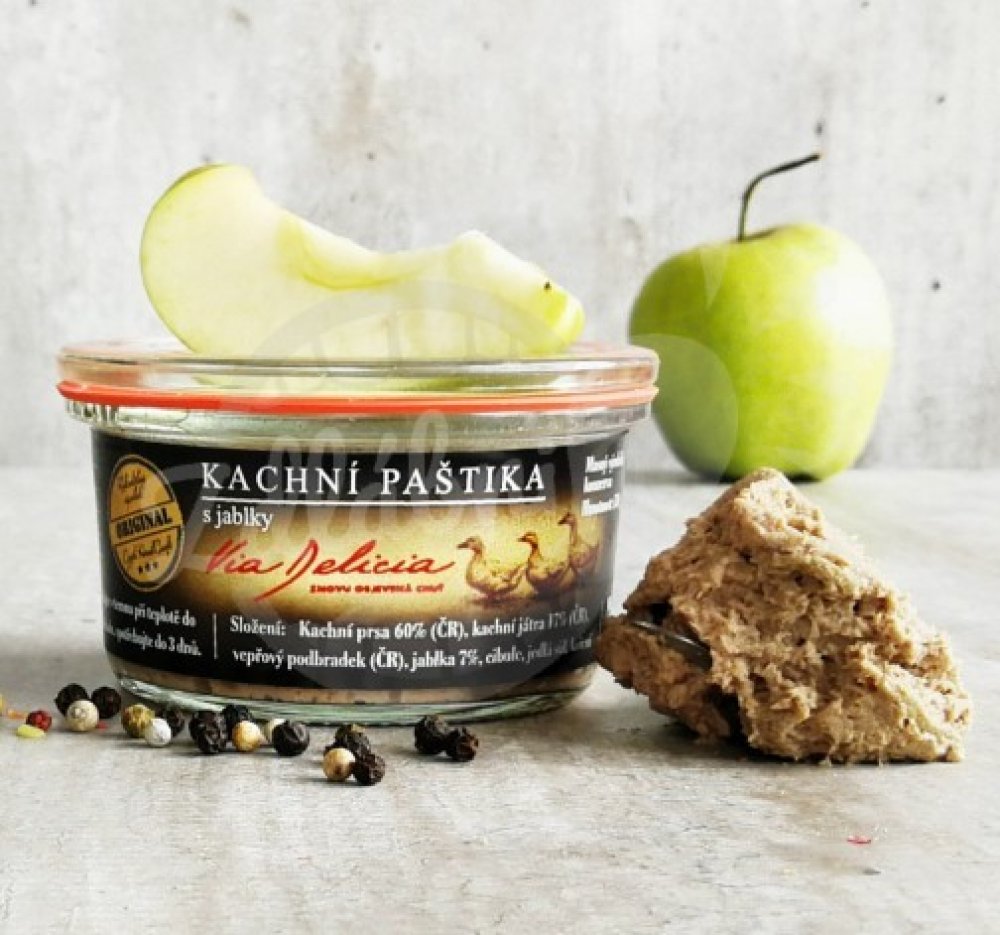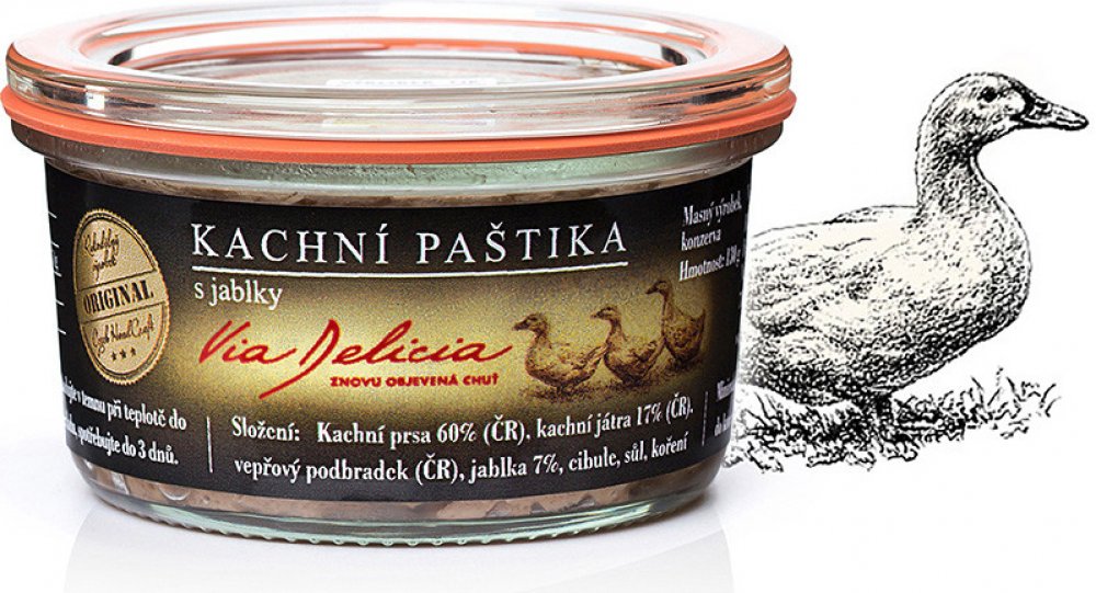 Složení: kachní maso 60%, kachní játra 17%, vepřové maso, jablka, cibule, jedlá sůl, koření.