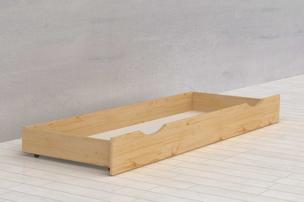 Úložný šuplík / box z masivu borovice je na kolečkách, sololitové dno.