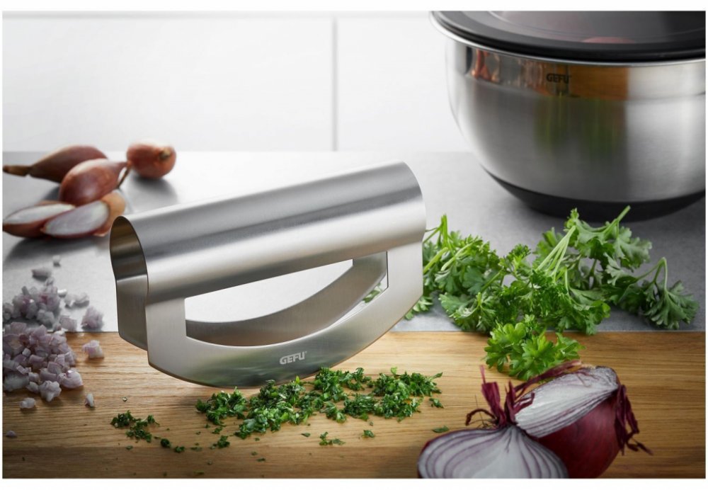 Neexistuje rychlejší a snadnější způsob, jak nakrájet cibuli, česnek, salátové listy a bylinky. To je přesně ten správný nástroj pro kuchaře a každého, kdo se chce stát jedním z nich. Tato nerezová kolébka na bylinky Viavo disponuje ostřím s dvojitým ostřím a ergonomickou rukojetí. Je stříbrné barvy a je možné ji mýt v myčce.