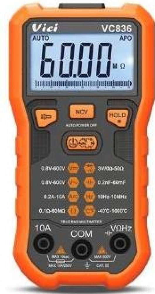 Měřící přístroj pro měření V ac,dc, A dc, ohm VICI VC836 je pokročilý ruční digitální multimetr True RMS s rozsáhlými funkcemi vhodný pro profesionály i domácí použití. Patří mezi ně měření DC/AC napětí a proudu, odporu, kapacity, frekvence, diod, zkratu, teploty (K-typ), hFE tranzistoru a bezkontaktní detekce napětí (NCV).