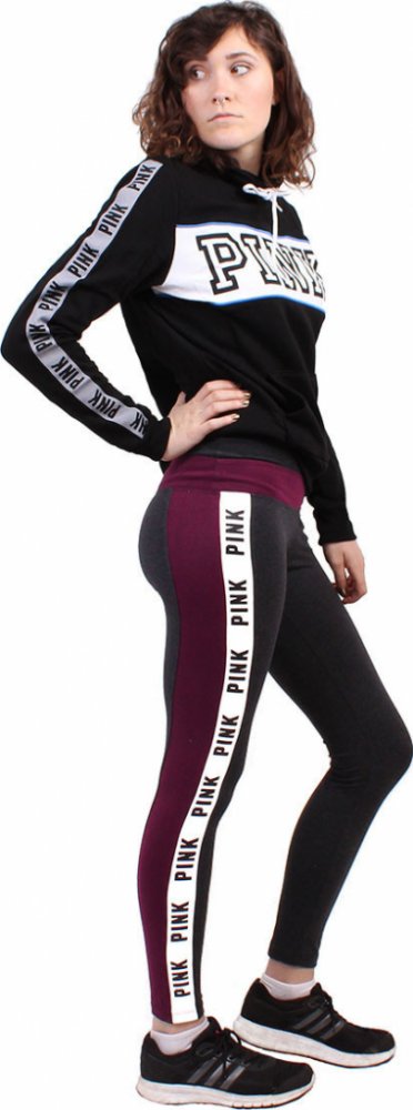 Dámské tmavě šedé legíny Victoria's Secret joga. Sportovní legíny jsou vhodné na všechny druhy sportu, dokonale sednou, jsou pohodlné a nepřekáží ani netáhnou. Funkční legíny zdobí fialový pruh okolo pasu a podélně na vnější straně nohavic. Na vnější straně se nachází také bílý pruh s černým nápisem PINK.