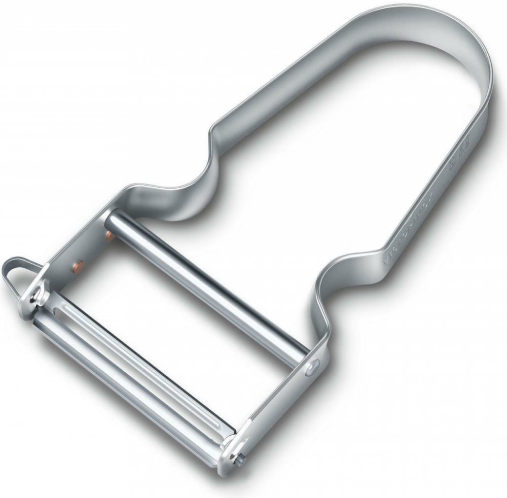Ikonická kuchyňská škrabka Victorinox Rex s minimalistickým designem. Zachovává vitamíny v potravinách tím, že je loupe blízko dužiny a minimalizuje tak odpad. Disponuje ergonomicky tvarovanou rukojetí, která je vhodná pro praváky i leváky. Obsahuje příčnou výkyvnou čepel s rovným ostřím i boční integrované očko pro odstranění kazů v zelenině. S celkovou délkou 11 cm. Není určena k mytí v myčce nádobí. Rozměry: 110 x 65 x 12 mm Materiál střenky: hliník Materiál čepele: nerezová ocel Váha: 14g