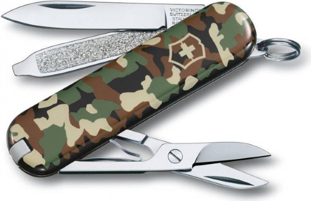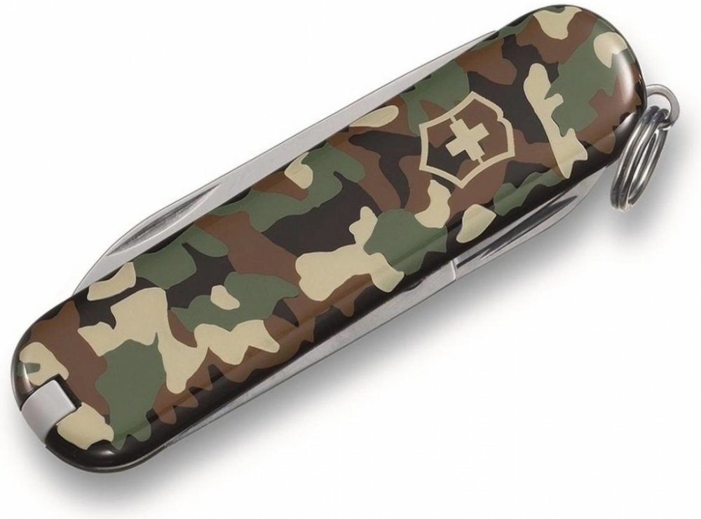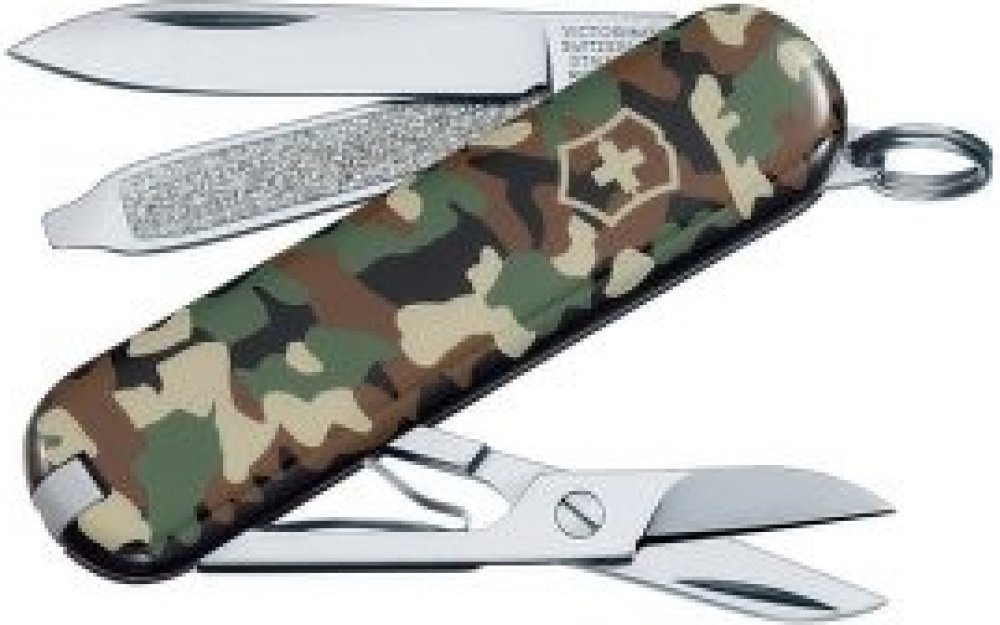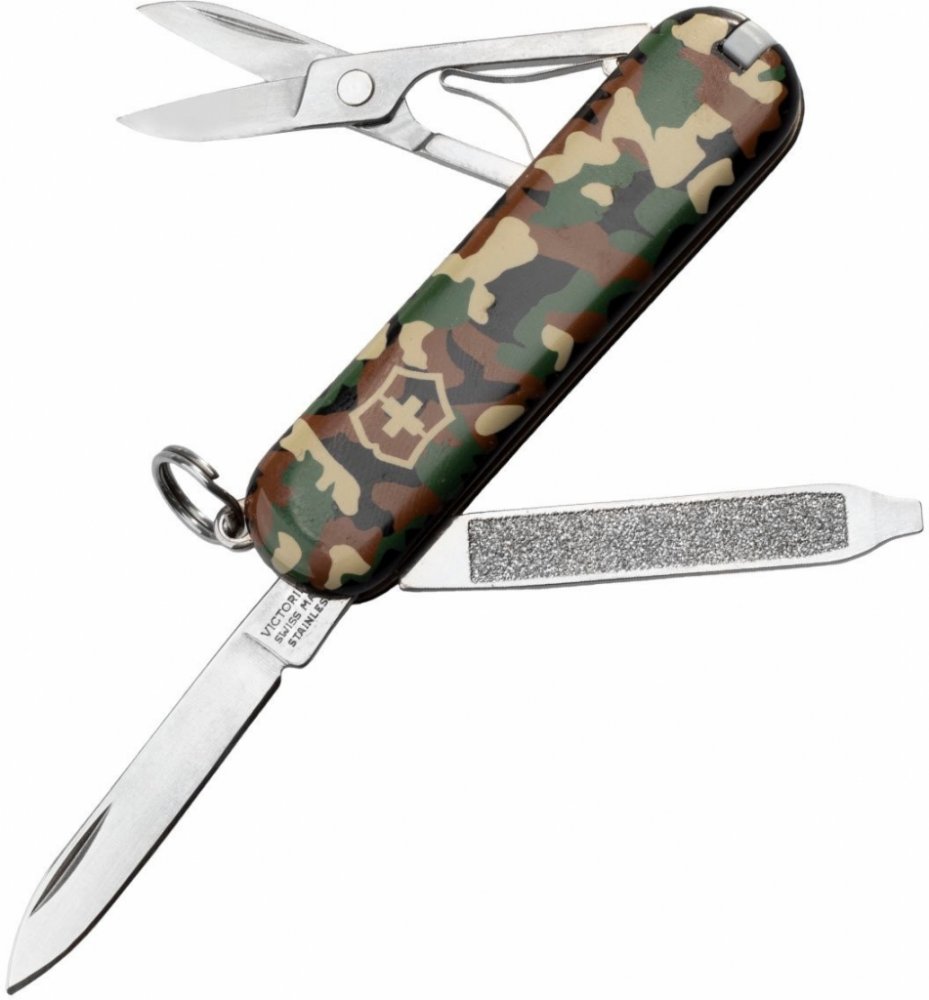 Malý kapesní švýcarský nůž Victorinox Classic SD Camouflage s nůžkami a šroubovákem pro každodenní použití, ale i při manikúře či oříznutím volných nití. Dodává se v klasickém maskáčovém barevném provedení.