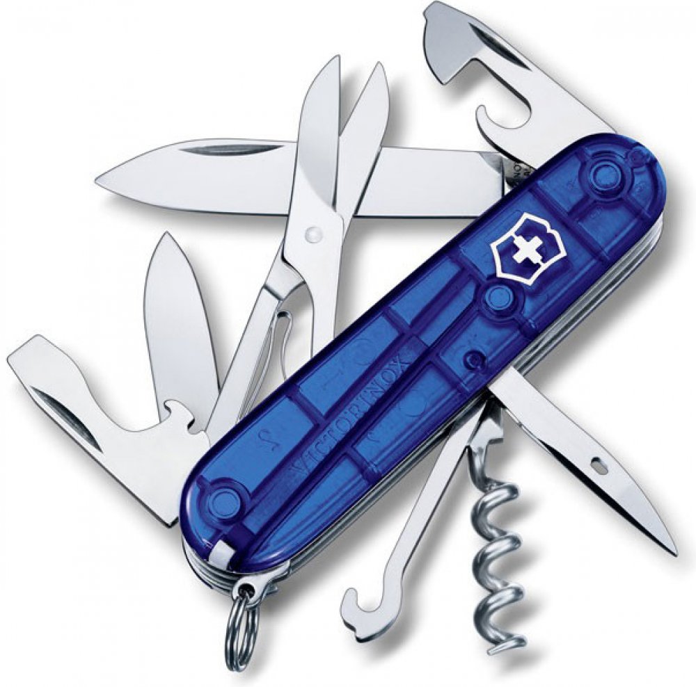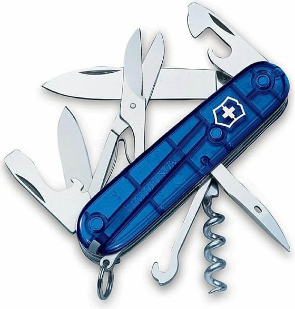 Středně velký kapesní švýcarský nůž Victorinox CLIMBER Blue Translucent je vhodný na lezení po horách či turistiku, jeho součástí jsou i nůžky i víceúčelový háček.