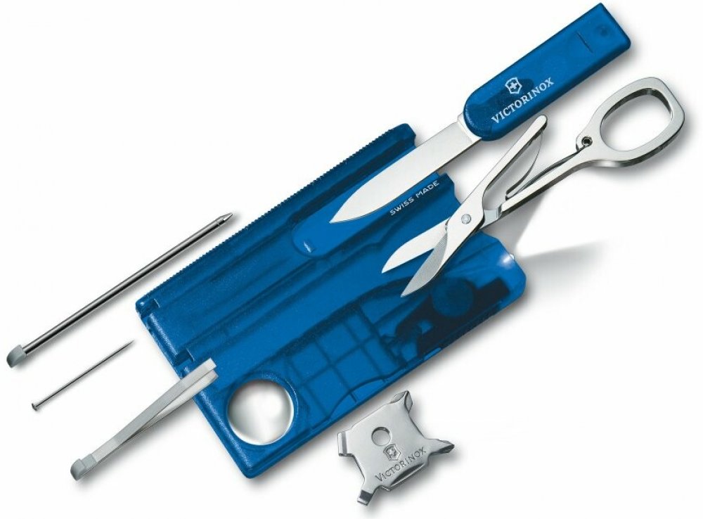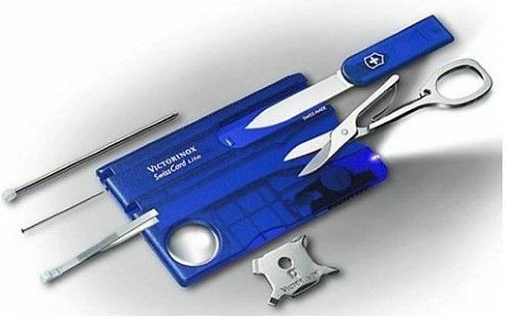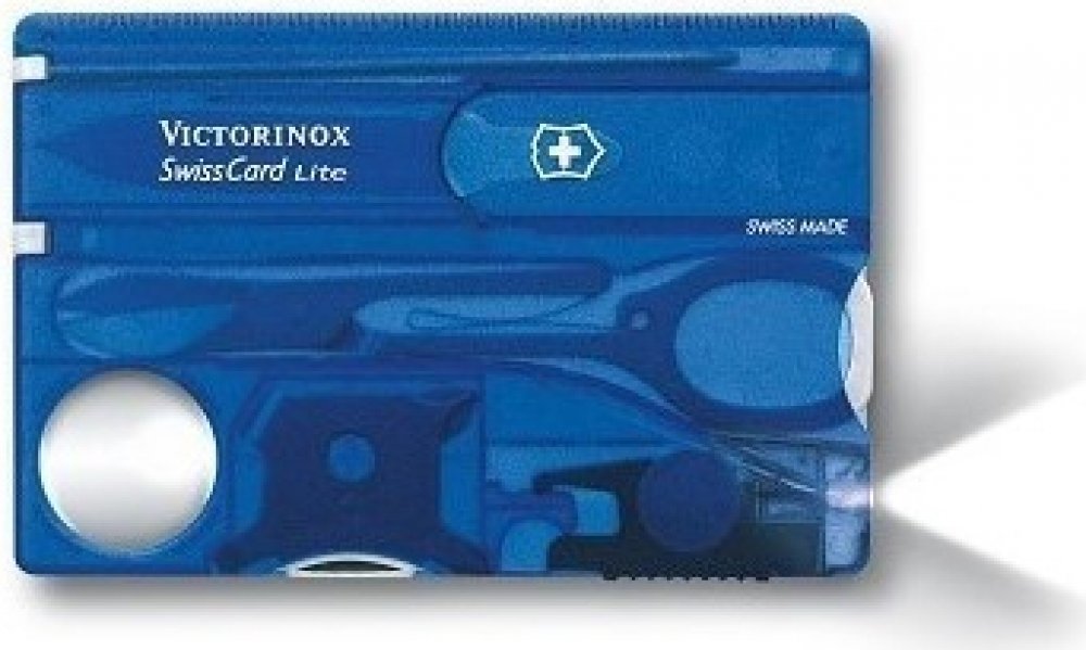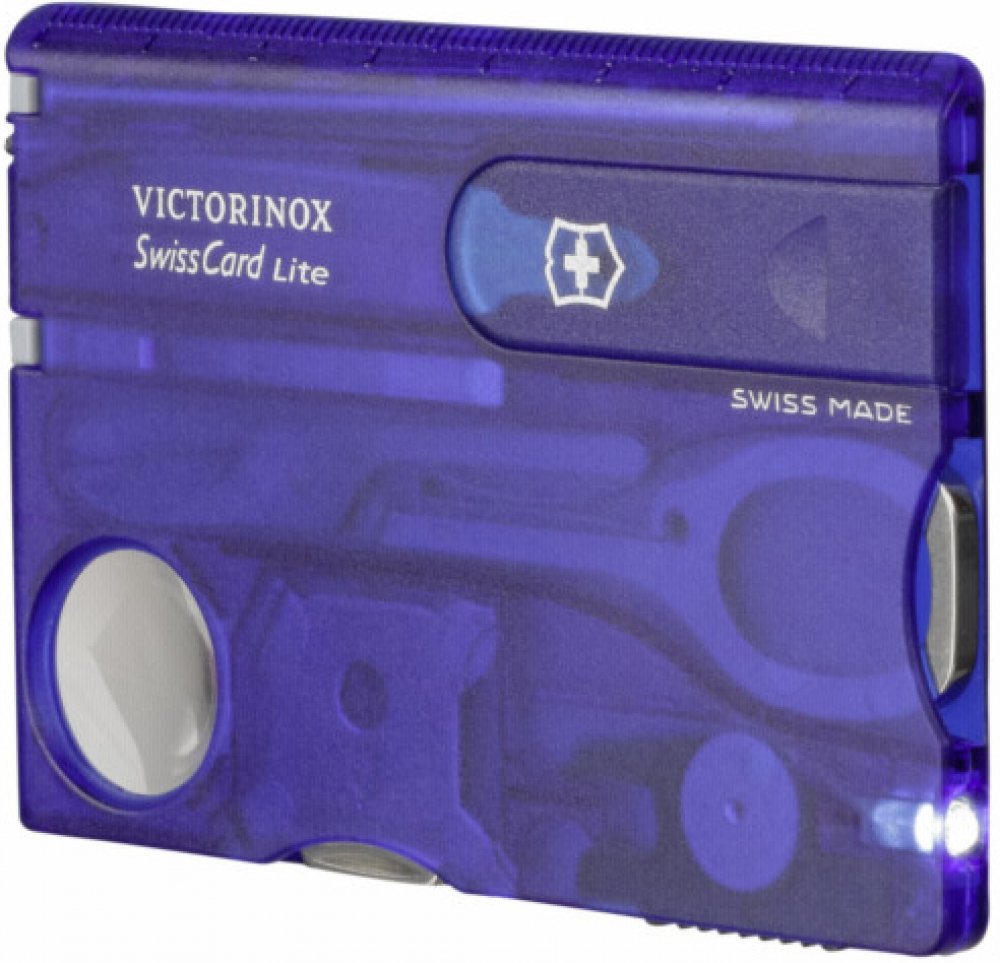 Multifunkční nástroj Victorinox SwissCard Lite Blue Transculent švýcarské výroby v imitaci platební karty s funkcemi kapesního nože ve svém nitru s LED světlem a lupou a mnoha jinými funkcemi.