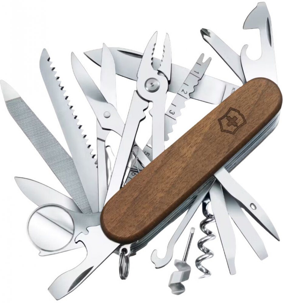 Švýcarský nůž Victorinox SwissChamp je vybaven čepelí z kvalitní nerezové oceli o délce 6,8 cm a při váze 185 gramů už o něm v kapse budete vědět. Délka střenek z ořechového dřeva je 91 mm. Na noži najdete těchto 29 funkcí:
