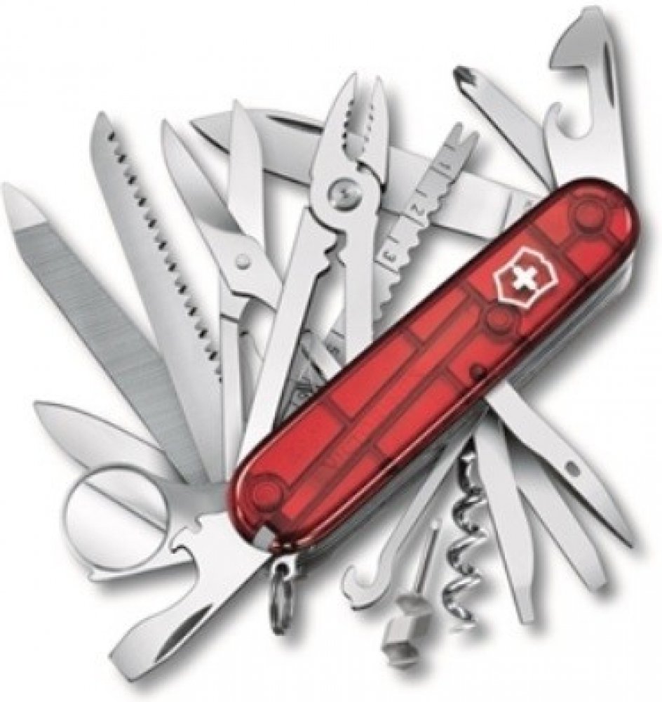 Středně velký kapesní nůž Victorinox SWISS CAMP Red Translucent je špičkovým společníkem na outdoorové použití i pro použití v interiéru. Multifunkční nástroj s mnoha funkcemi. Vyrobený ve Švýcarsku.