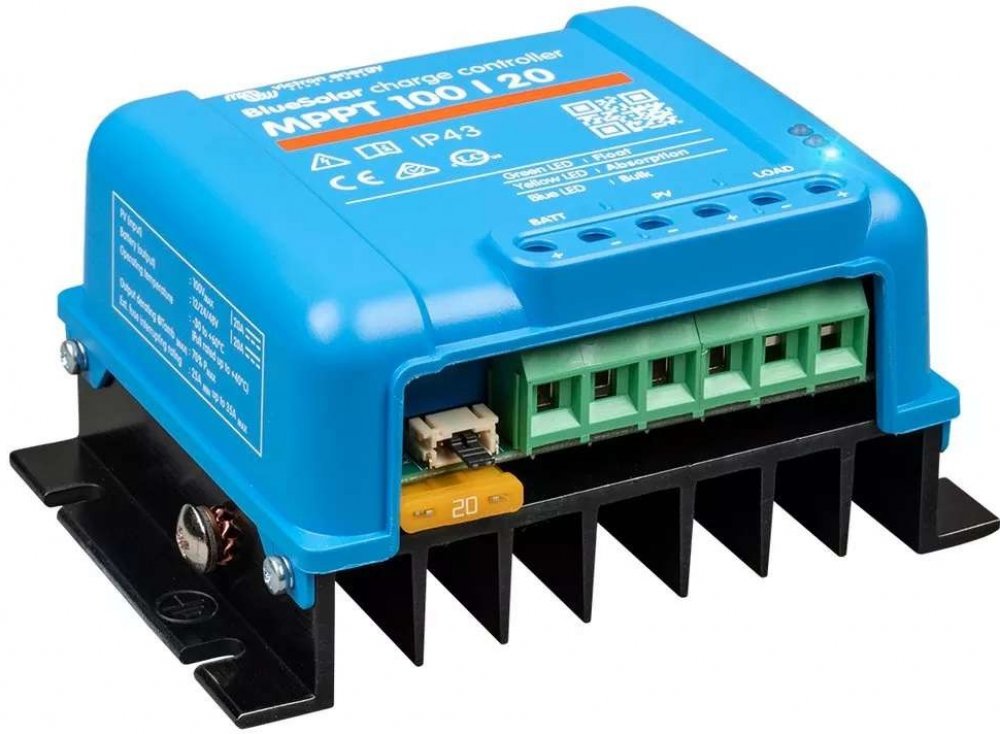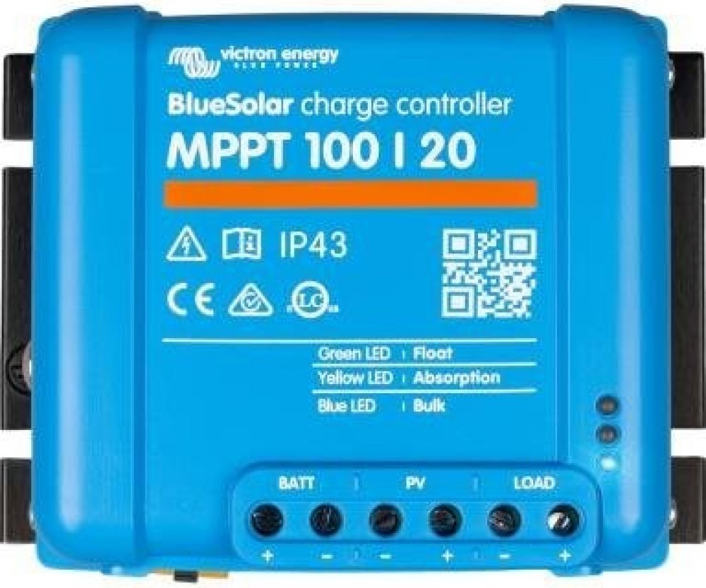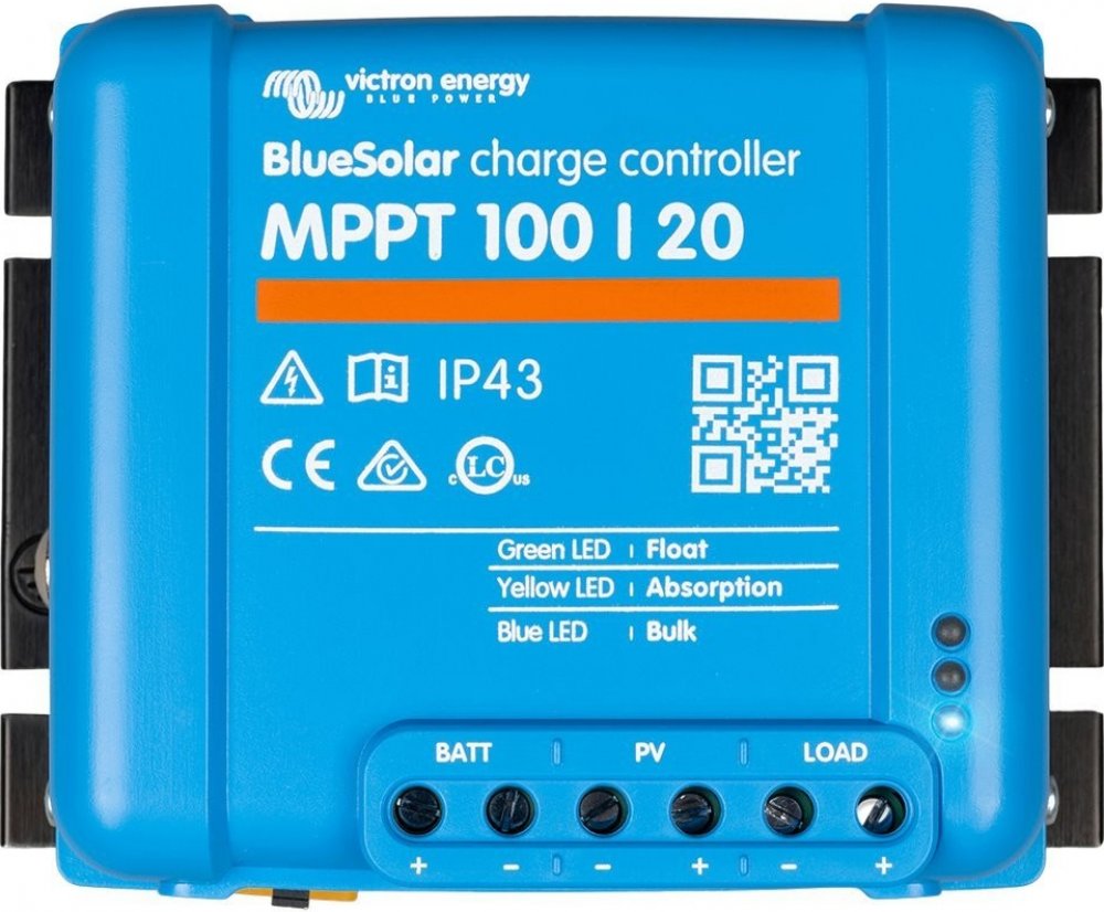 Victron BlueSolar 100/20 MPPT; Robustní a rychlý MPPT regulátor pro náročné podmínky s napětím panelů až 100 V , maximální nabíjecí proud 20 A . Baterie 12/24/48 V , FV max. 290/580/1160 Wp . Solární regulátor BlueSolar zpracovává energii ze solárních...