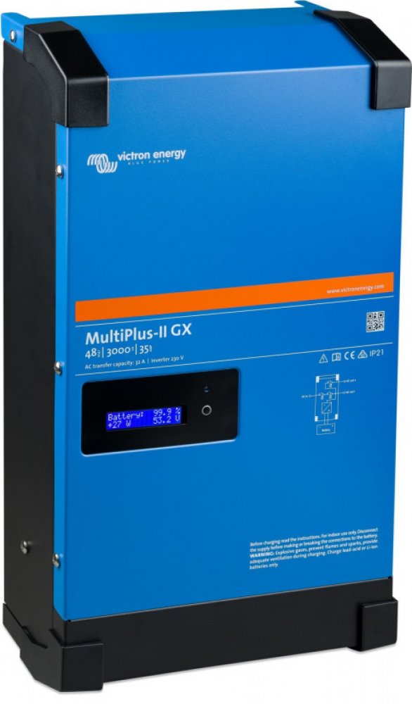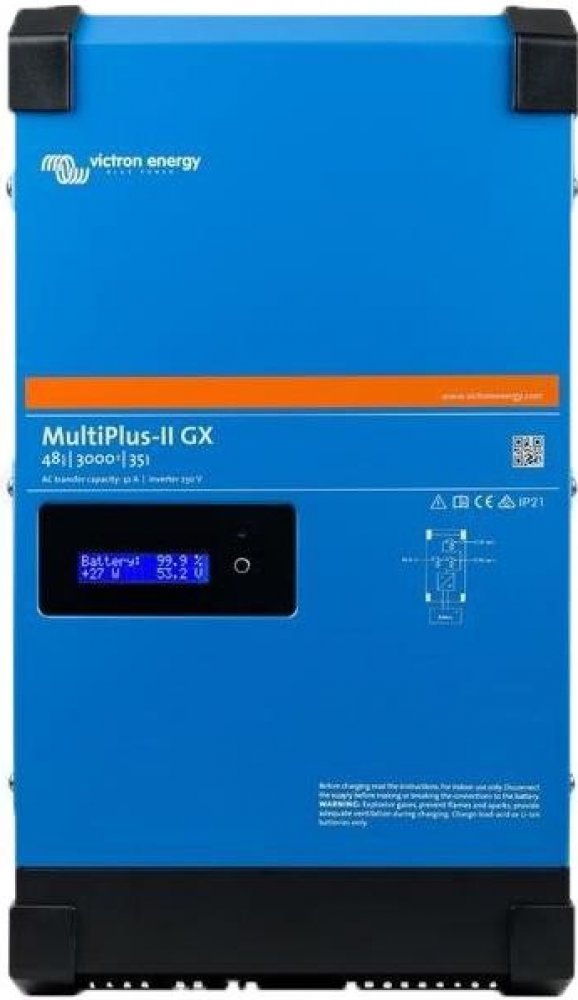 MultiPlus-II GX oproti MultiPlus II navíc obsahuje zařízení GX a displej 2 x 16 znaků. Na displeji se zobrazí parametry solárního regulátoru a měniče. Ke stejným parametrům lze přistupovat pomocí smartphonu, nebo jiného zařízení podporujícího Wi-Fi. Integrované zařízení GX obdoba zařízení Venus GX, pouze integrováno přímo v jednotce zahrnuje: Rozhraní VE.Can USB port Ethernetový port Port VE.Direct MultiPlus-II GX kombinuje funkce MultiPlus a MultiGrid Má všechny funkce jednotky MultiPlus a navíc s možností připojení externího proudového čidla pro funkce PowerControl a PowerAssist s optimalizaci vlastní spotřeby max. 32A. Má také všechny funkce jednotky MultiGrid se zabudovanou anti-islanding ochranou na svém AC vstupu zesílená ochrana zabránění nežádoucím dodávkách do distribuční sítě v Konkurenční objednací čísla: 4747 Victron 4747 Měnič/nabíječ Victron Energy MultiPlus-II GX48V/5000VA/70A-50A Victron Energy b. v.